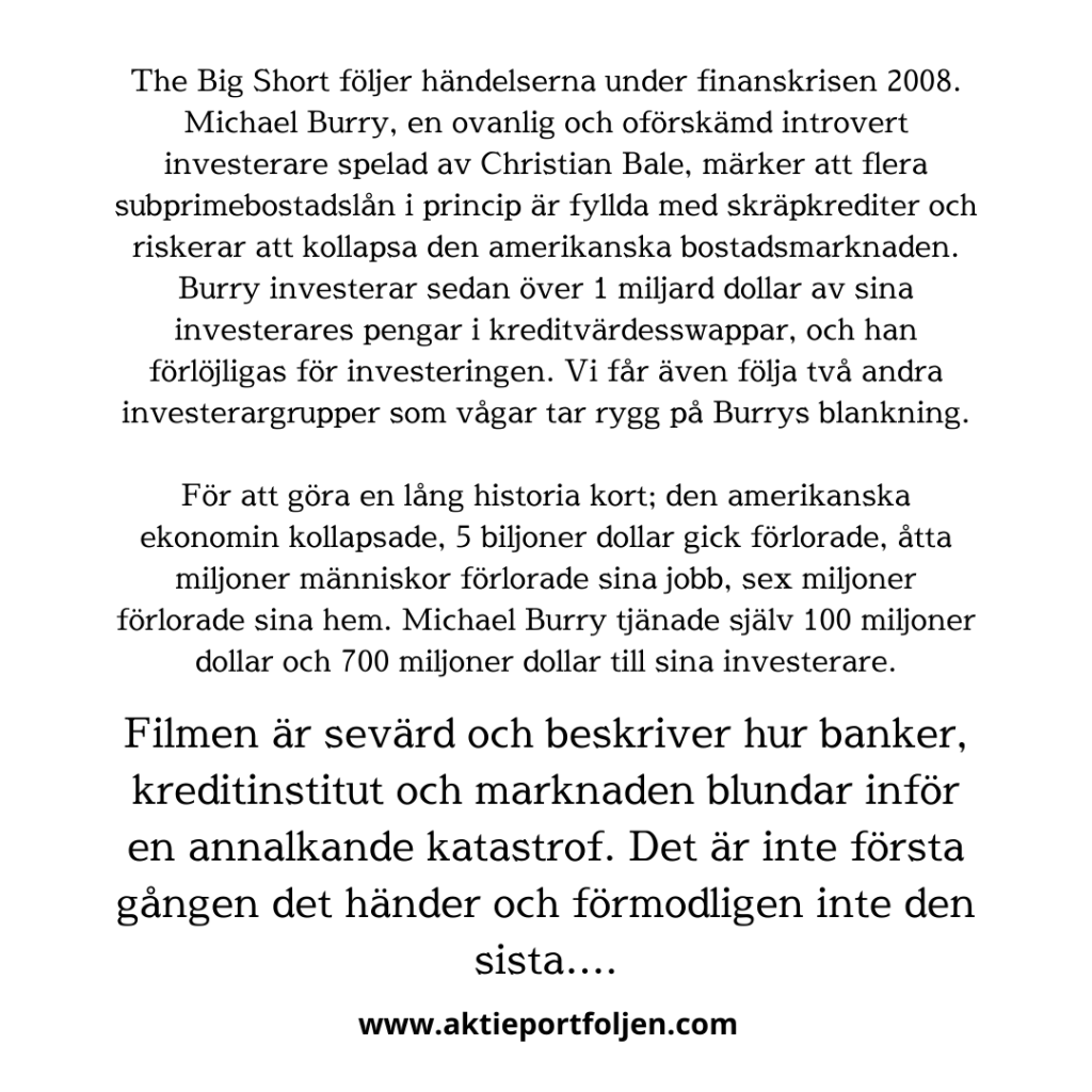 Jag blev inbjuden av Sony Entertainment för att se en förhandsvisning av filmen ”Dumb Money” utan krav på motprestation från min sida. Jag gillade filmen och den handlar om aktier så jag vill ändå gärna berätta vad jag tycker om filmen. För mig var filmen en rolig, underhållande film med en mängd karaktärer som jag gillade. Filmen handlar om GameStop-aktien och hur den blev världens mest handlade aktie. Paul Dano spelar huvudrollen som Keith Gill, aka Roaring Kitty, en relativt okänd personlighet på Reddit-kanalen wallstreetbets, som blev enorm när han orkestrerade en short squeeze mot GameStop. Filmen är en lättförståelig dramakomedi med enkel handling. Jag kan verkligen rekommendera filmen, man behöver inte ens vara aktieintresserad som jag, för att gilla den. Filmen har premiär i Sverige i början av oktober. GameStop-aktien blev föremål för en finansiell maktstrid mellan amerikanska hedgefonder på Wall Street och amatörhandlare som flockades kring forumet wallstreetbets på Reddit. Hedgefonderna, särskilt Melvin Capital, hade blankat GameStop-aktien, alltså satsat emot aktien genom att låna aktier för att sälja på börsen. När lånet sedan skulle lämnas tillbaka köpte blankaren aktier för att lämna tillbaka, och hade då värdet på aktien sjunkit sedan blankningen gav det mellanskillnaden i vinst för blankaren. Om aktien istället stigit under tidsperioden så gick blankaren med förlust, och det var detta som wallstreetbets såg en möjlighet i. De iscensatte en så kallad “short squeeze”, en attack mot blankarna. Genom att många köpte aktier i bolaget på kort tid drevs aktiekursen upp, samtidigt som blankarna tvingades sälja. Melvin Capital förlorade flera miljarder dollar i januari.