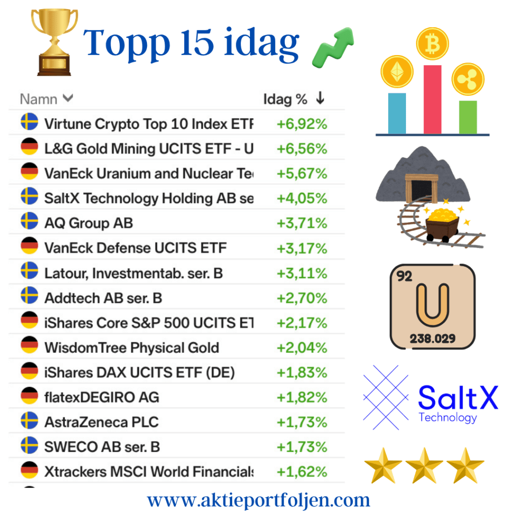L&G Gold Mining UCITS ETF +4,02% WisdomTree Physical Gold +1,67% VanEck Defense UCITS ETF +1,48% Clas Ohlson AB +1,36% flatexDEGIRO AG +1,23% Virtune Crypto Top 10 Index ETP +0,98% VanEck Uranium and Nuclear Technologies UCITS ETF +0,94% Mycronic AB +0,83% New Wave Group AB +0,81% AQ Group AB +0,74% SaltX Technology Holding AB +0,51% Atlas Copco AB +0,48% Xtrackers MSCI World Financials UCITS ETF +0,44% Dynavox Group AB +0,39% Hexagon AB +0,37%