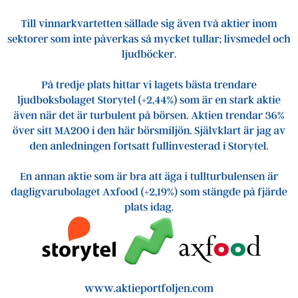 Till vinnarkvartetten sällade sig även två aktier inom sektorer som inte påverkas så mycket tullar; livsmedel och ljudböcker.