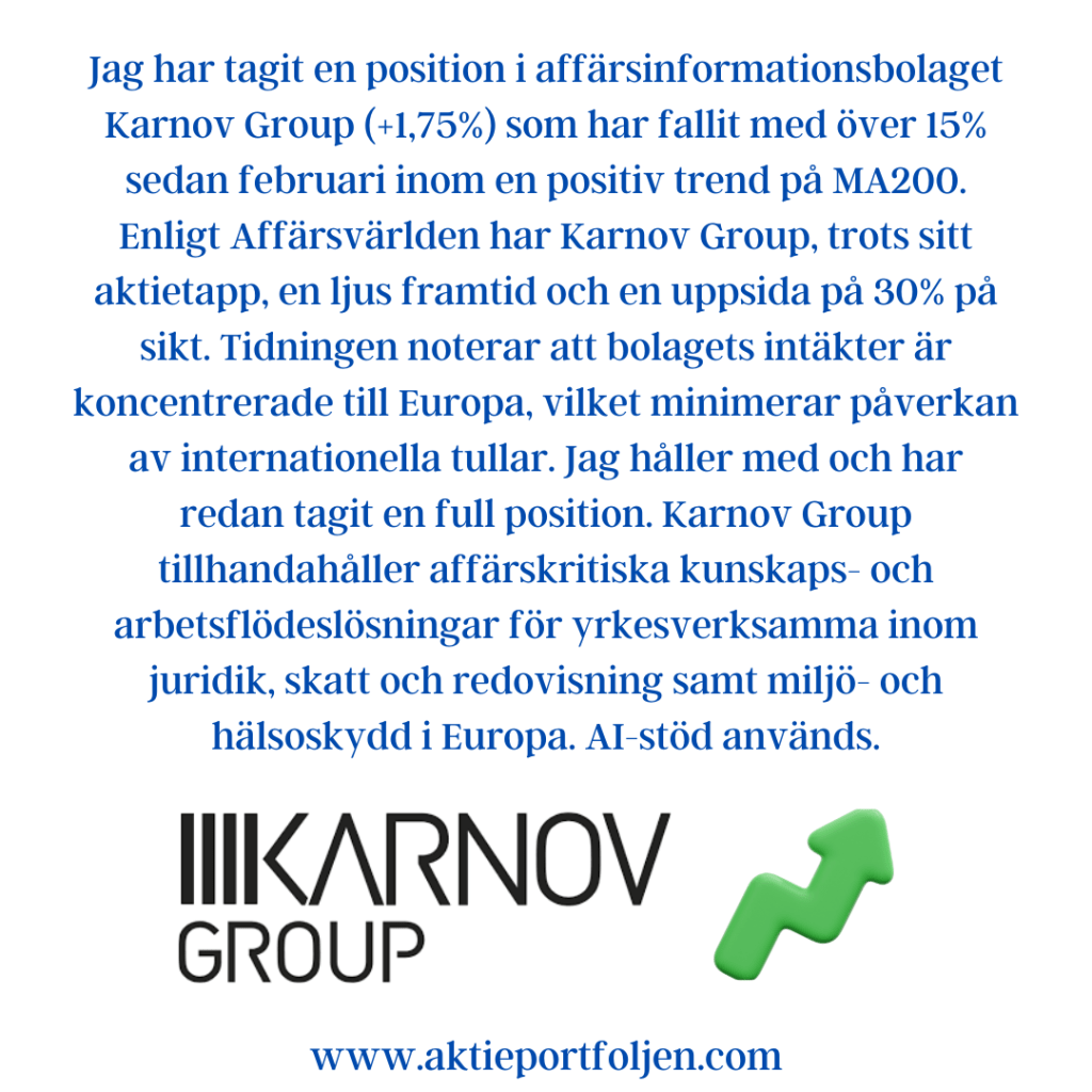 Jag har tagit en position i affärsinformationsbolaget Karnov Group (+1,75%) som har fallit med över 15% sedan februari inom en positiv trend på MA200. Enligt Affärsvärlden har Karnov Group, trots sitt aktietapp, en ljus framtid och en uppsida på 30% på sikt. Tidningen noterar att bolagets intäkter är koncentrerade till Europa, vilket minimerar påverkan av internationella tullar. Jag håller med och har redan tagit en full position. Karnov Group tillhandahåller affärskritiska kunskaps- och arbetsflödeslösningar för yrkesverksamma inom juridik, skatt och redovisning samt miljö- och hälsoskydd i Europa. AI-stöd används.