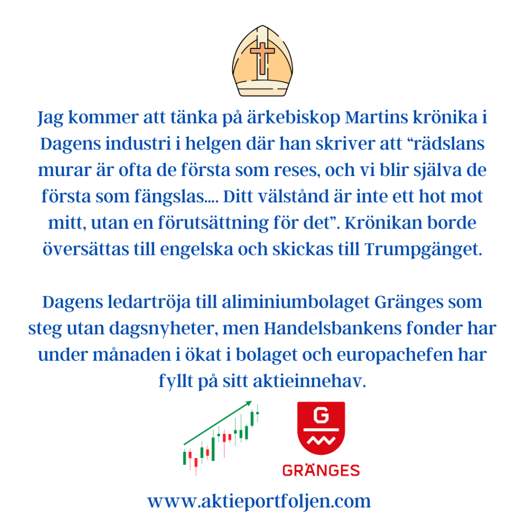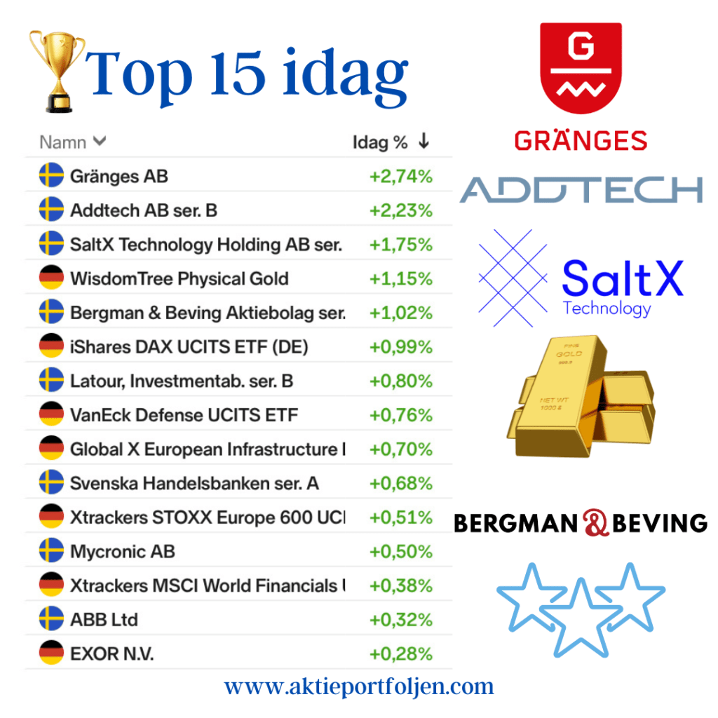 På tredje plats kom aliminiumbolaget Gränges (+2,28%) som har en stark position i USA, vilket skyddar mot tullrelaterade risker.
