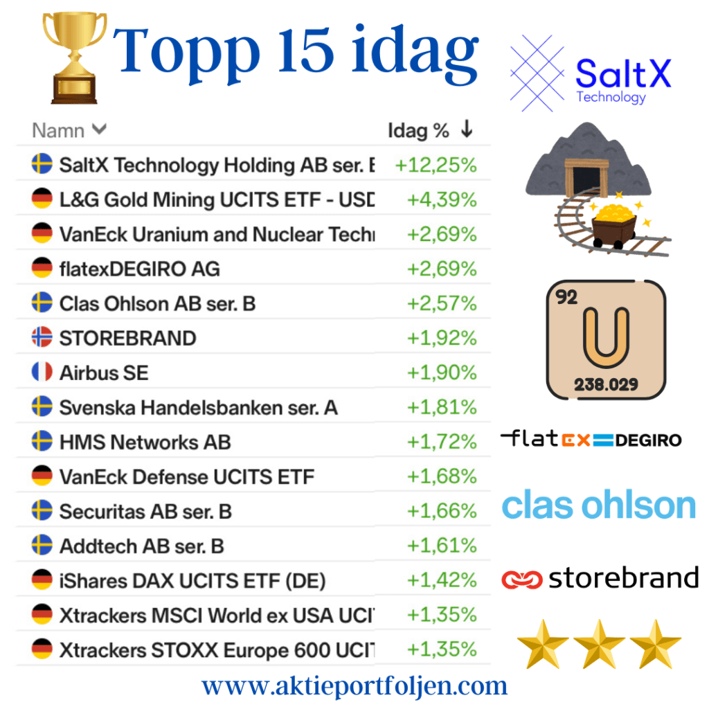 Det gäller även etf:en VanEck Uranium and Nuclear Technology (+2,69%) där efterfrågan på kärnkraftsteknologi är hög både från stater och stora bolag.