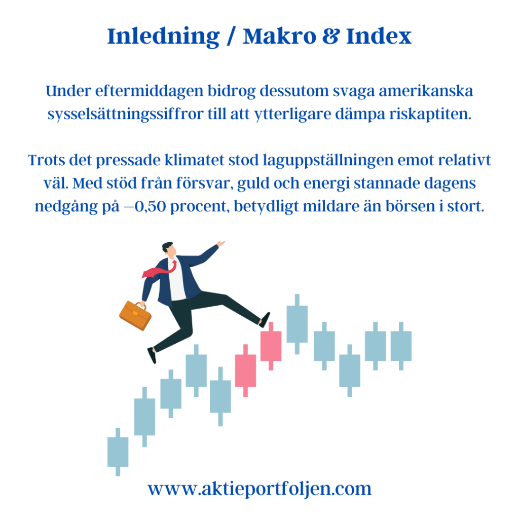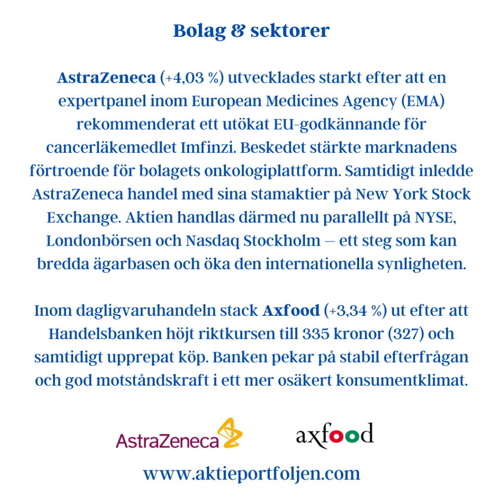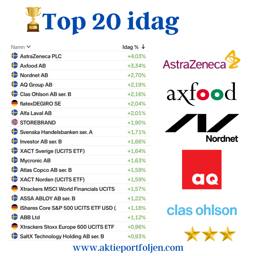 L&G Gold Mining UCITS ETF – +4,74% Nordnet – +3,63% VanEck Uranium & Nuclear – +3,49% WisdomTree Physical Gold – +3,36% Linc – +2,77% VanEck Defense ETF – +2,48% Investor B – +2,35% Catena – +2,30% Lundbergföretagen – +2,16% Handelsbanken A – +2,15% Assa Abloy – +2,06% AQ Group – +1,97% Atlas Copco B – +1,96% ABB – +1,96% Global X European Infrastructure – +1,95% XACT Småbolag – +1,90% XACT Sverige – +1,88% Alfa Laval – +1,88% flatexDEGIRO – +1,82% Xtrackers STOXX Europe 600 – +1,80%