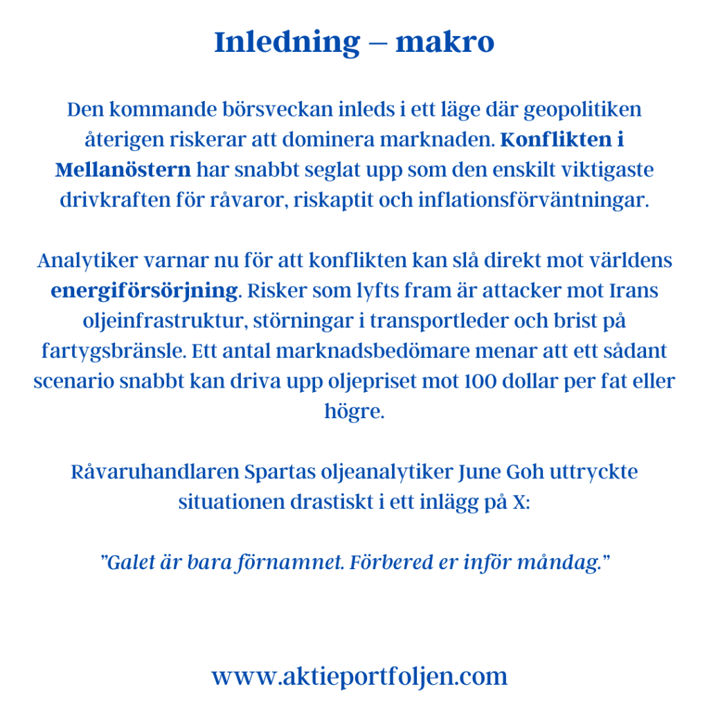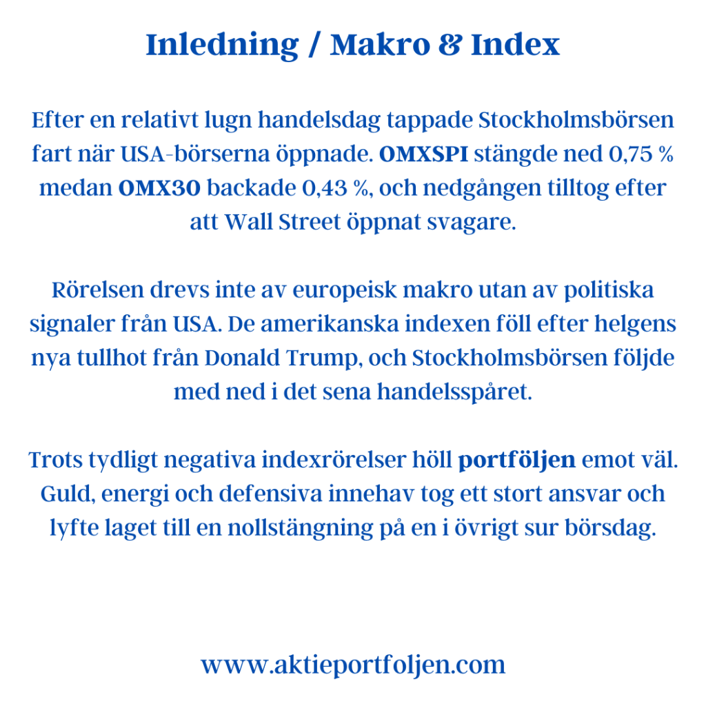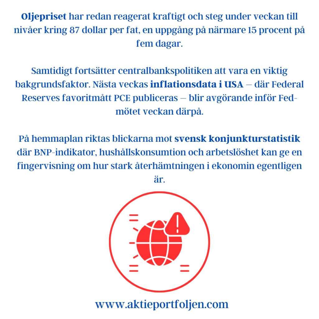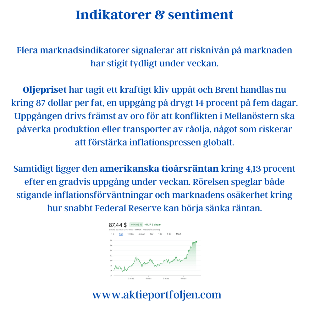Fredshopp driver riskaptit Signaler om dialog i Mellanöstern räckte för att lyfta börserna brett. Samtidig hedge via råvaror Att både guld, uran och försvar går starkt visar att marknaden inte fullt ut köper ett snabbt fredsscenario. Guldets återtagna roll Den initiala nedgången följdes av ett tekniskt stöd och en återhämtning – ett tecken på att investerare återigen söker skydd när osäkerheten biter sig fast. Bredden bekräftar styrkan Uppgången omfattar såväl småbolag som globala index, vilket ger tyngd åt rörelsen.