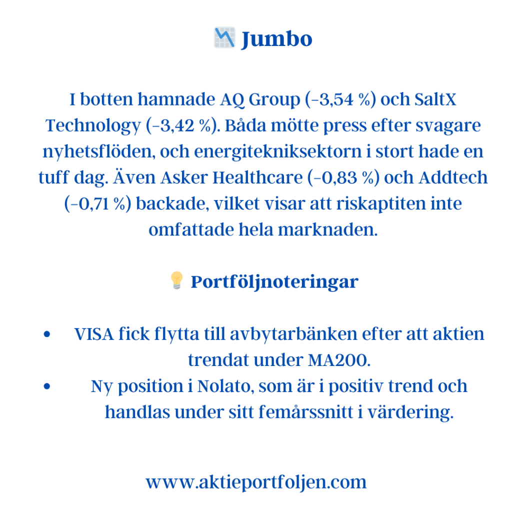 I botten återfanns Virtune Crypto Top 10 Index (−4,60 %) och SaltX (−3,07 %). Även Storebrand (−0,89 %), Handelsbanken (−0,73 %) och AstraZeneca (−0,71 %) noterades på minus.
