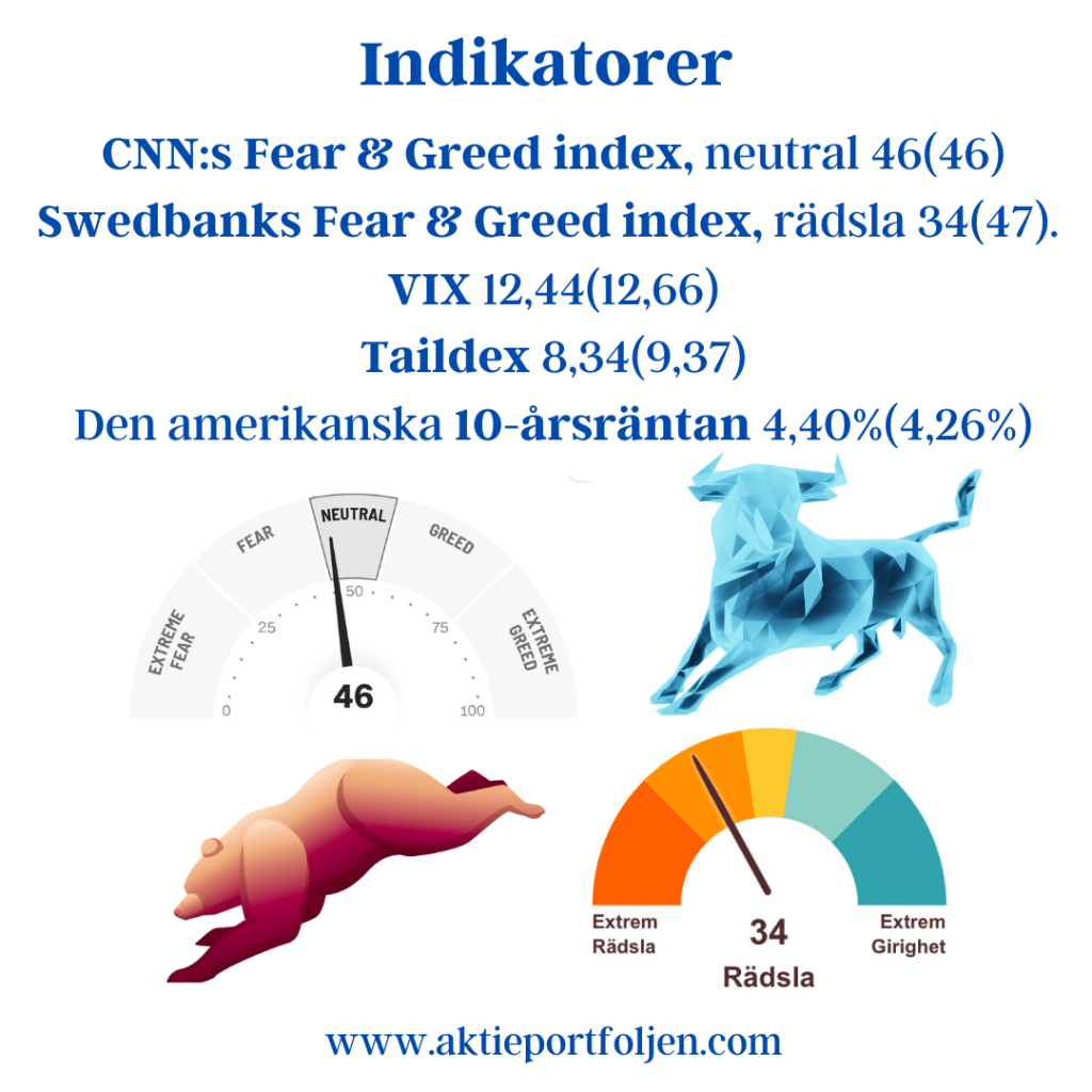 Investerarsentimentet enligt AAII visar samtidigt på en viss återhämtning från tidigare pessimism. Optimismen har ökat, men utan att slå över i eufori. Sammantaget pekar indikatorerna mot ett vänteläge, där marknaden inväntar nya impulser för att ta riktning.