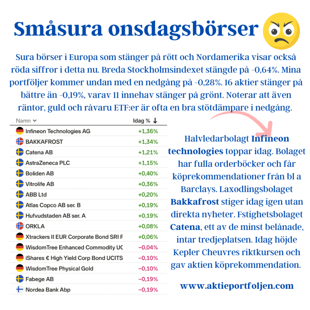 Sura börser i Europa som stänger på rött och Nordamerika visar också röda siffror i detta nu. Breda Stockholmsindexet stängde på -0,64%. Mina portföljer kommer undan med en nedgång på -0,28%. 16 aktier stänger på bättre än -0,19%, varav 11 innehav stänger på grönt. Noterar att även räntor, guld och råvaru ETF:er är ofta en bra stötdämpare i nedgång. Halvledarbolagt Infineon technologies toppar idag. Bolaget har fulla orderböcker och får köprekommendationer från bl a Barclays. Laxodlingsbolaget Bakkafrost stiger idag igen utan direkta nyheter. Fstighetsbolaget Catena, ett av de minst belånade, intar tredjeplatsen. Idag höjde Kepler Cheuvres riktkursen och gav aktien köprekommendation.