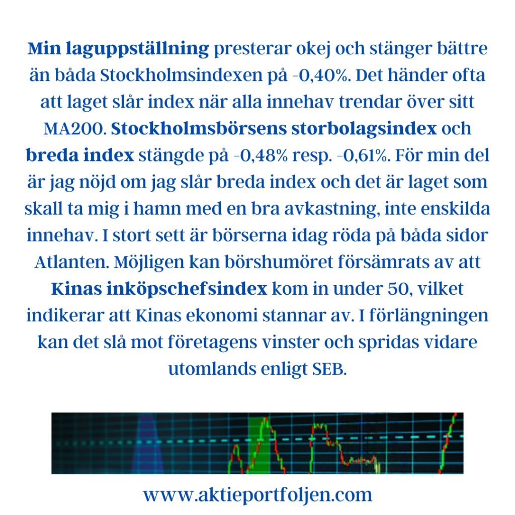 Nästbäst stängde Handelsbanken (+2,27%). Igår kom beskedet att Industrivärden fyllde på sitt innehav av A-aktier med 239 miljoner kronor.