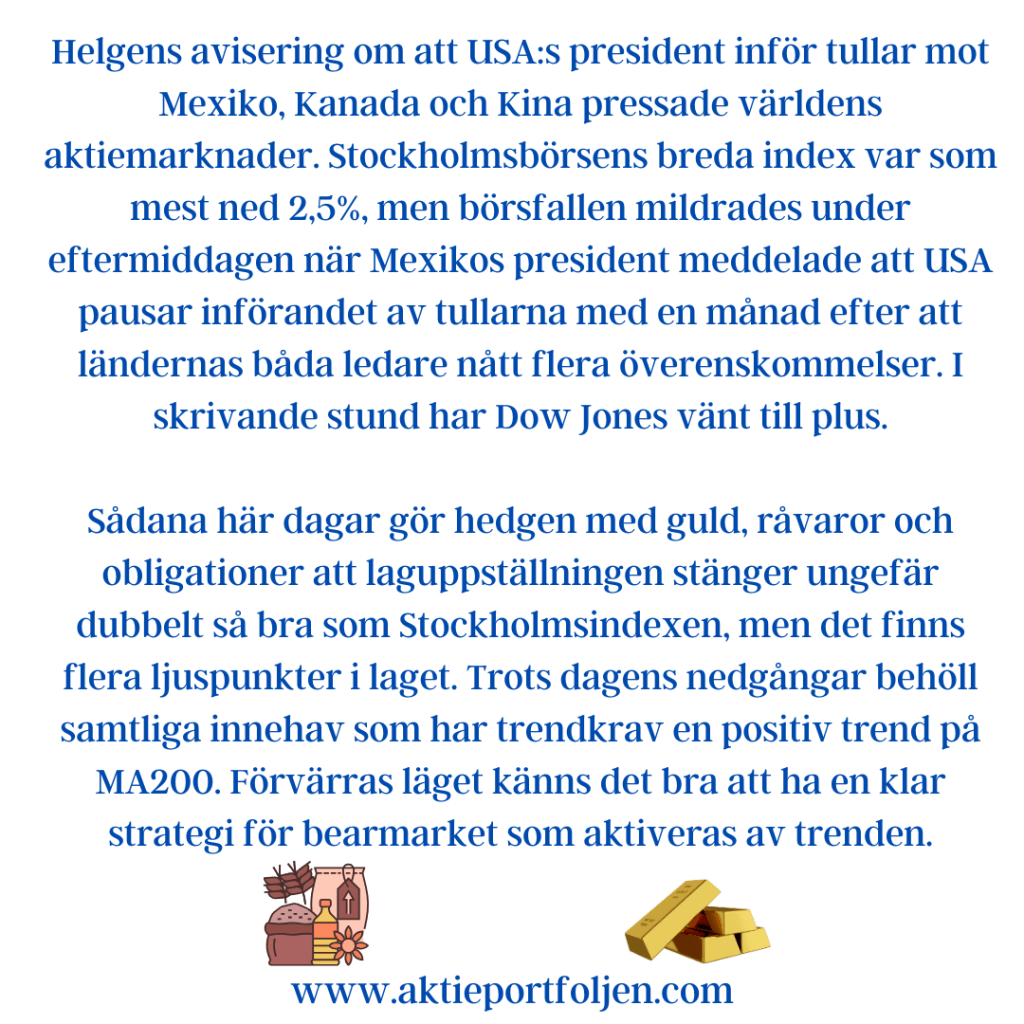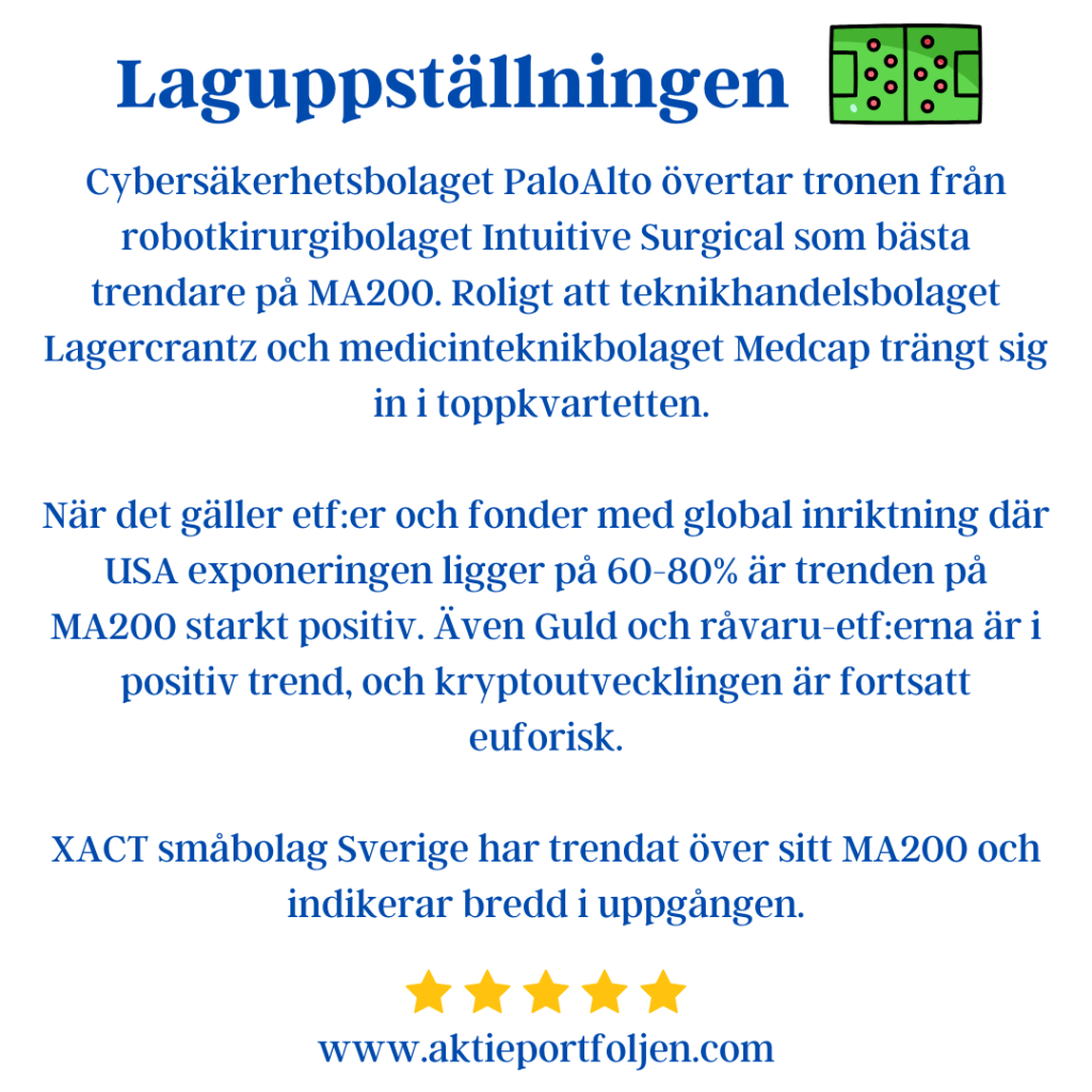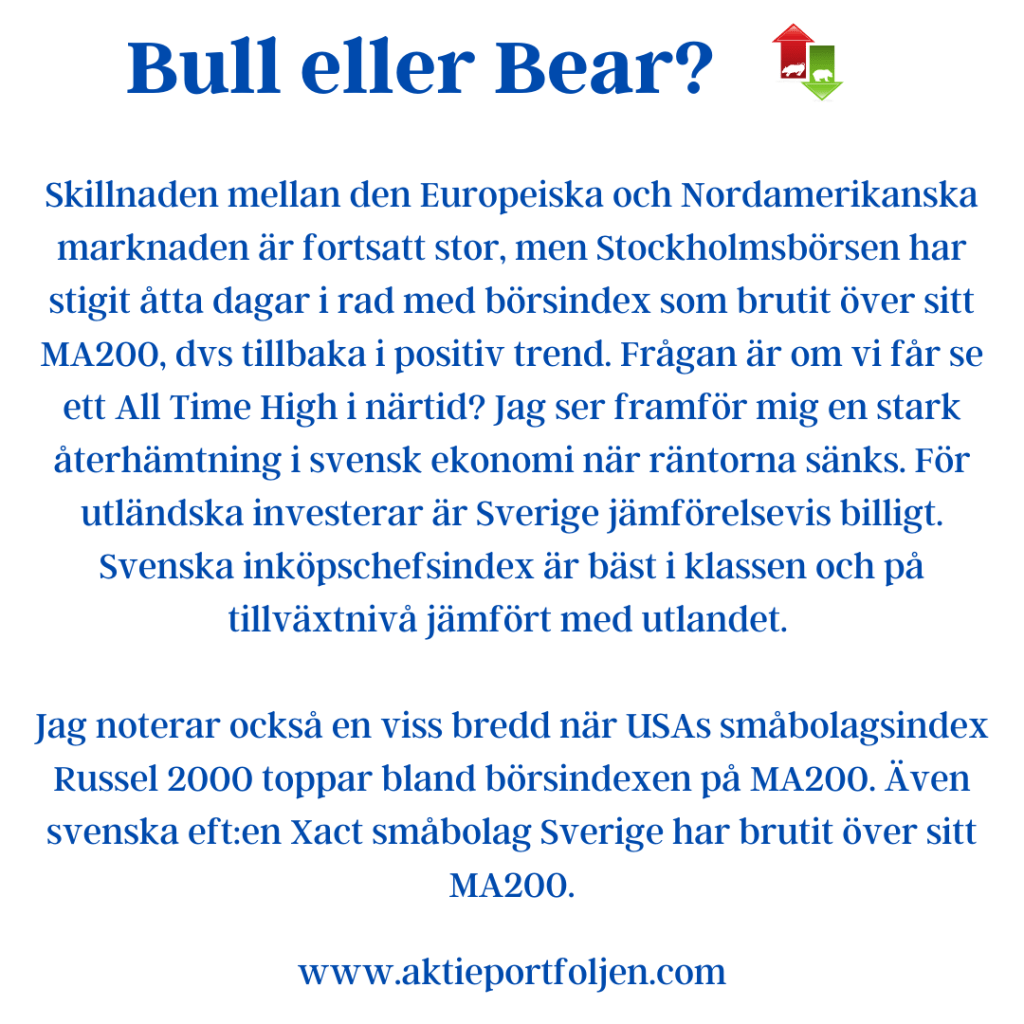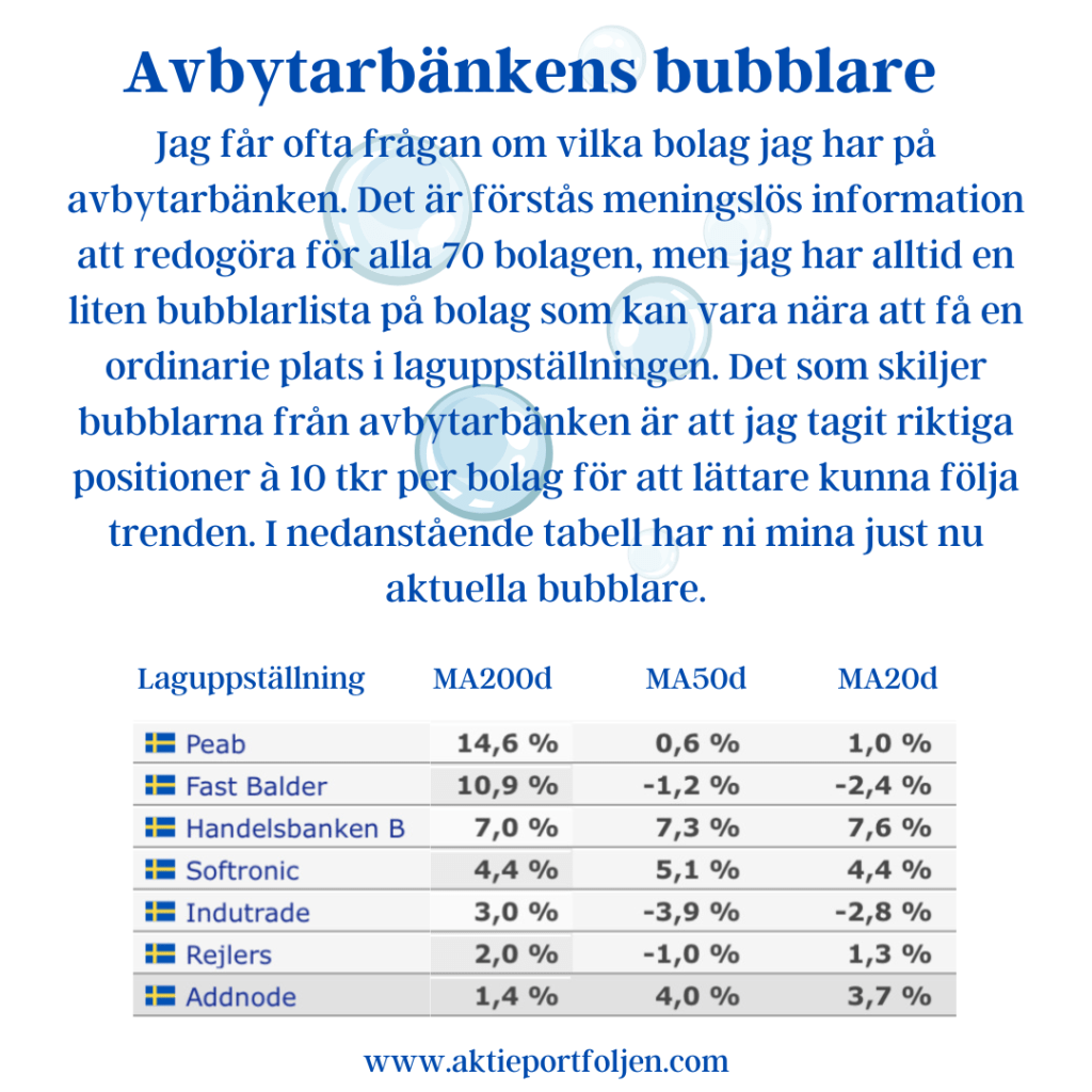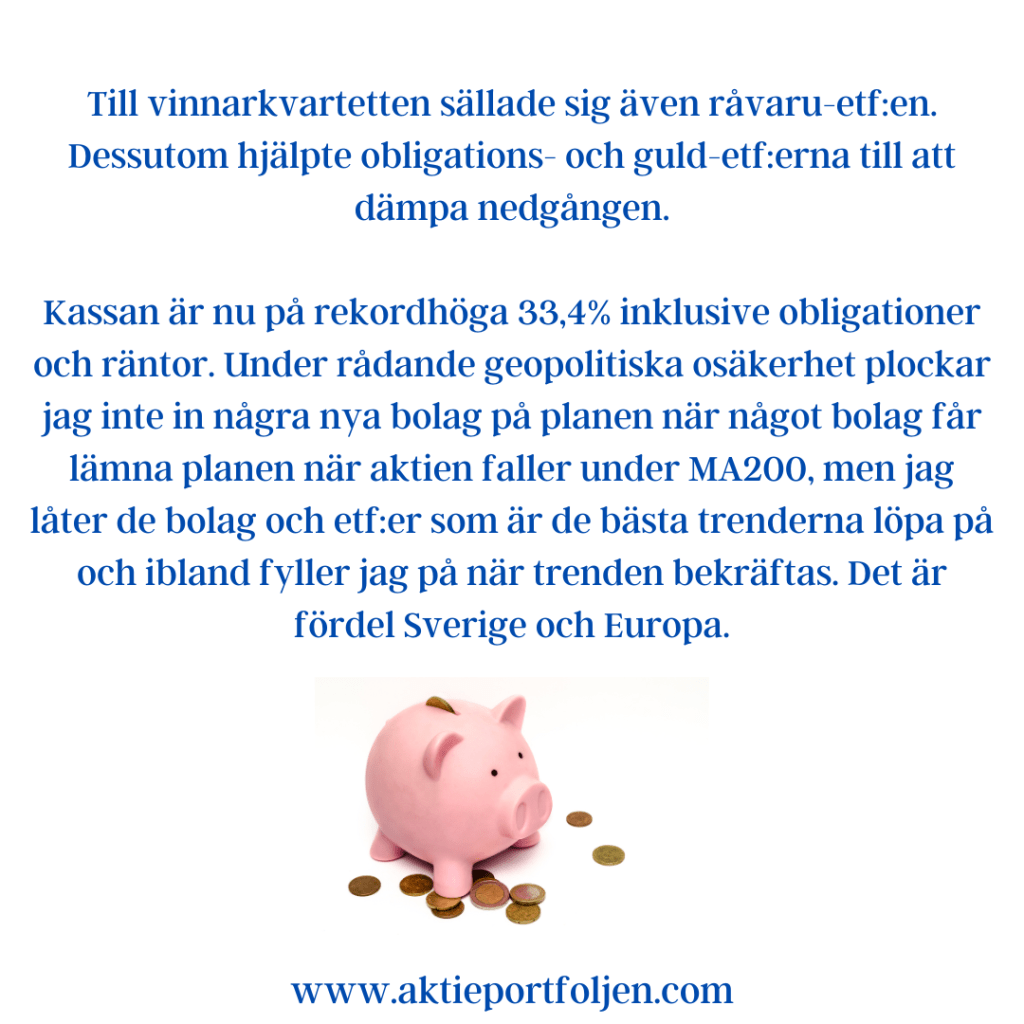 Kassan är nu på rekordhöga 33,4% inklusive obligationer och räntor. Under rådande geopolitiska osäkerhet plockar jag inte in några nya bolag på planen när något bolag får lämna planen när aktien faller under MA200, men jag låter de bolag och etf:er som är de bästa trenderna löpa på och ibland fyller jag på när trenden bekräftas. Det är fördel Sverige och Europa.