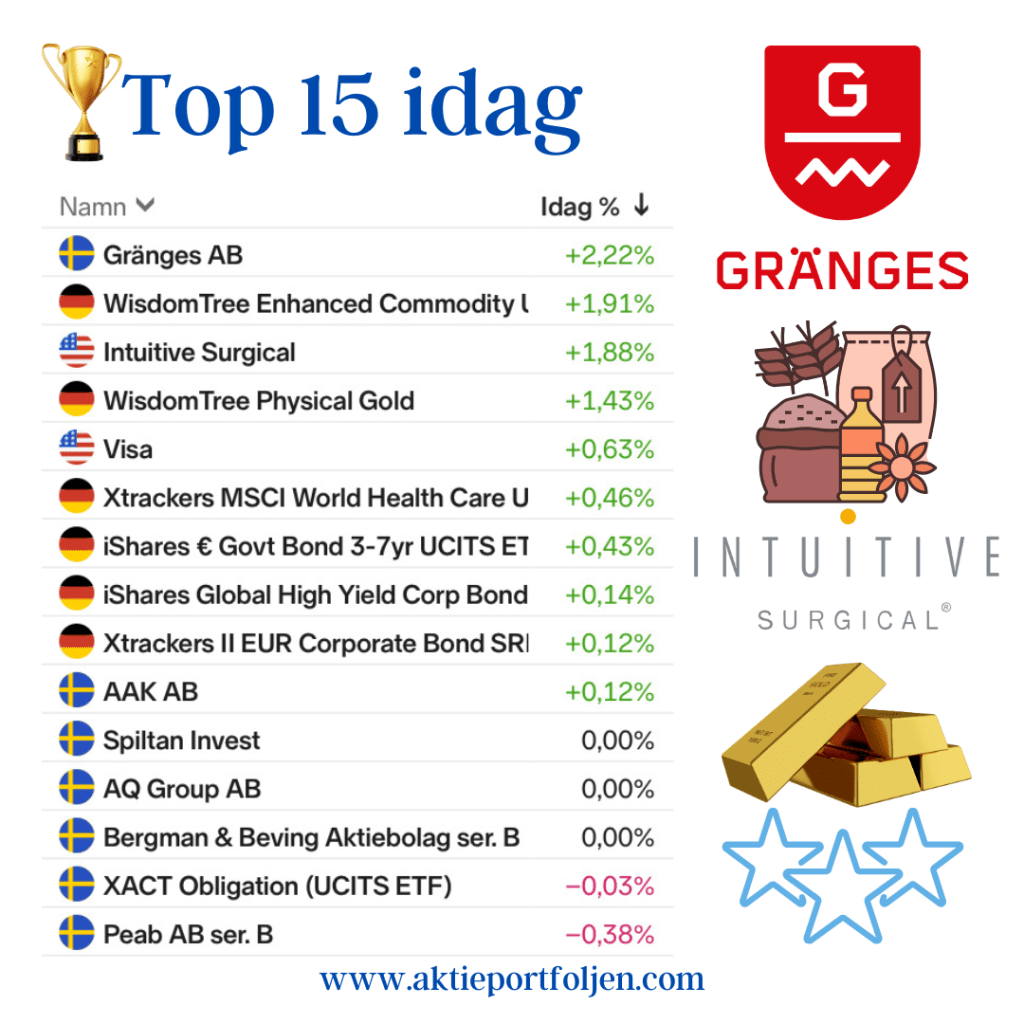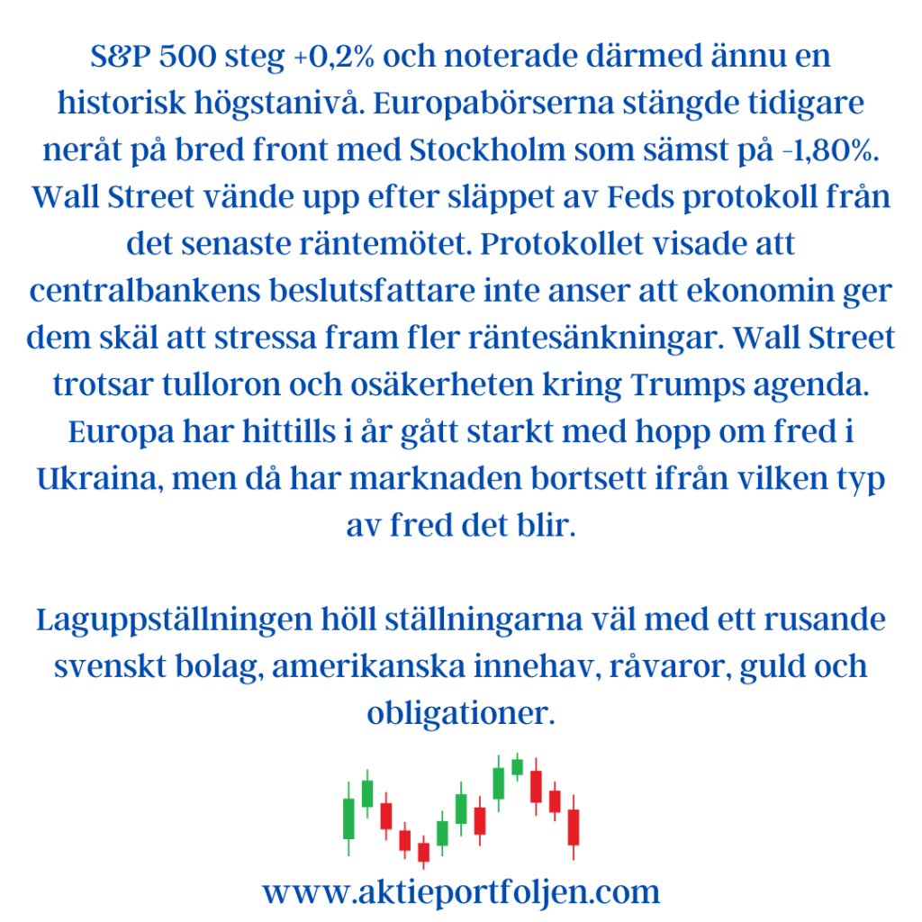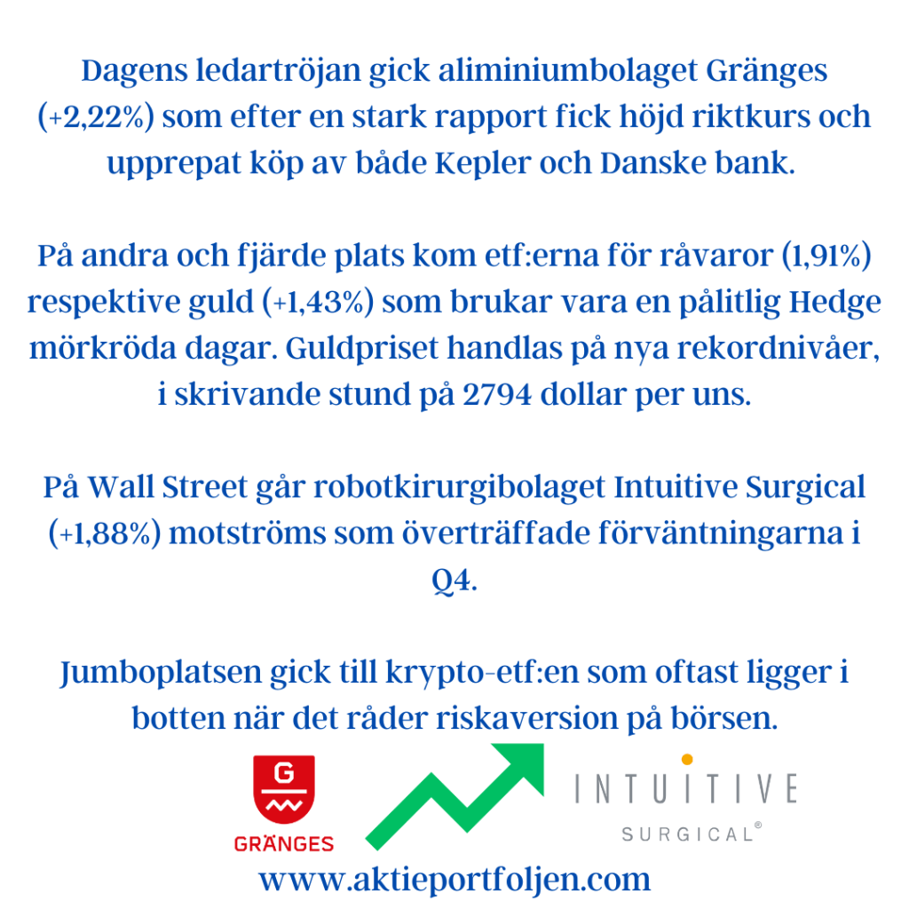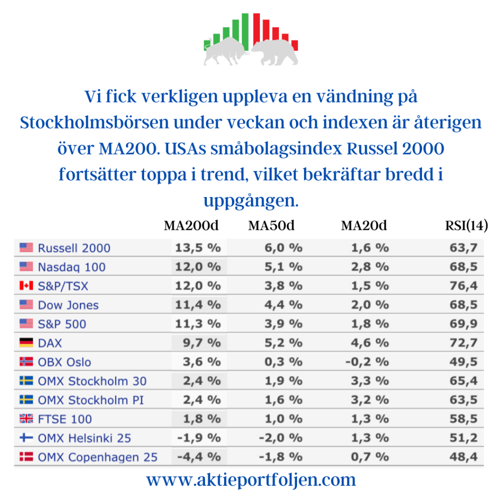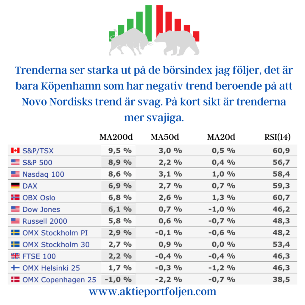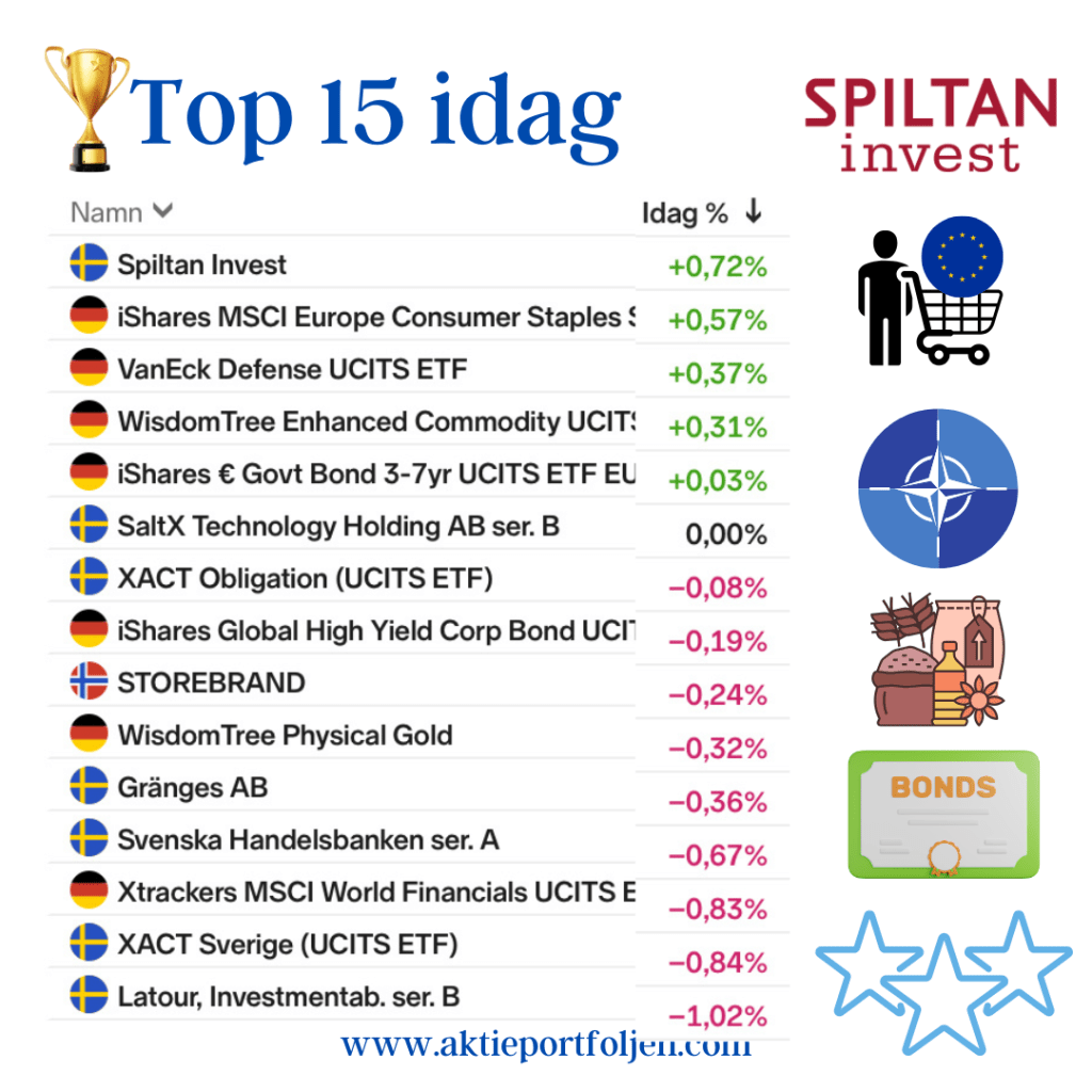 Kassan är nu på rekordhöga 33,4% inklusive obligationer och räntor. Under rådande geopolitiska osäkerhet plockar jag inte in några nya bolag på planen när något bolag får lämna planen när aktien faller under MA200, men jag låter de bolag och etf:er som är de bästa trenderna löpa på och ibland fyller jag på när trenden bekräftas. Det är fördel Sverige och Europa.