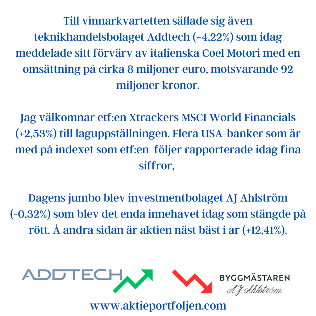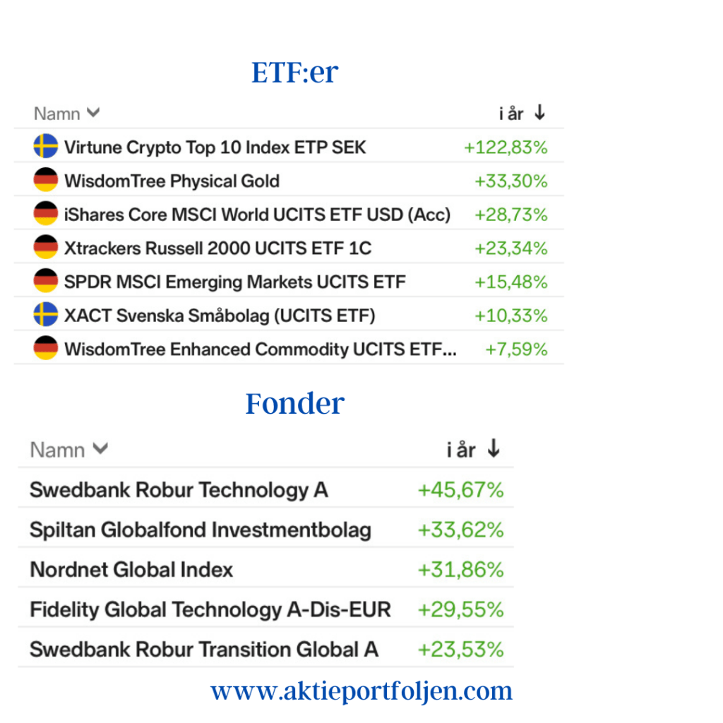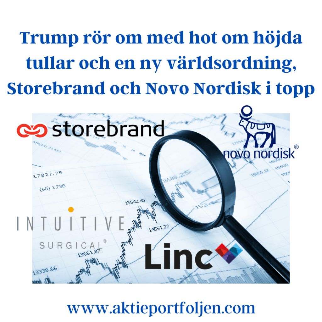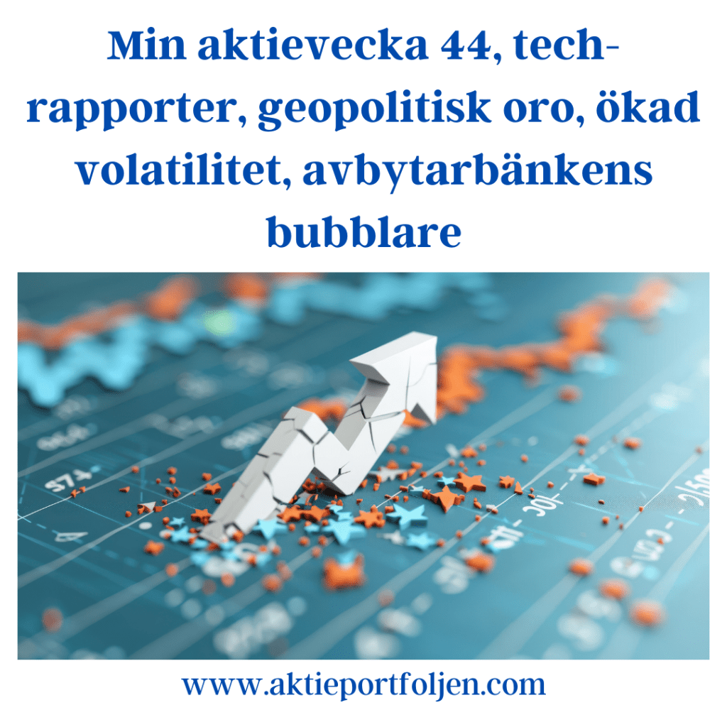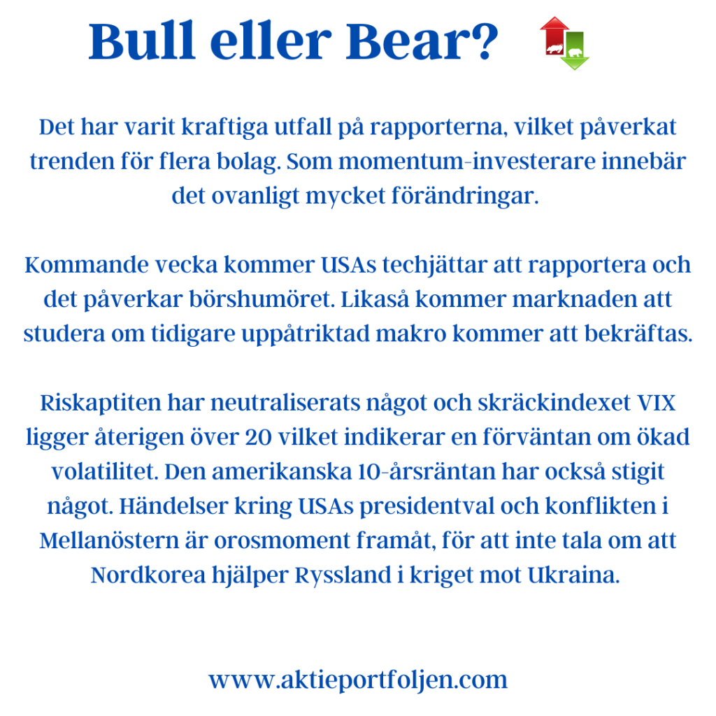 Kassan är nu på rekordhöga 33,4% inklusive obligationer och räntor. Under rådande geopolitiska osäkerhet plockar jag inte in några nya bolag på planen när något bolag får lämna planen när aktien faller under MA200, men jag låter de bolag och etf:er som är de bästa trenderna löpa på och ibland fyller jag på när trenden bekräftas. Det är fördel Sverige och Europa.