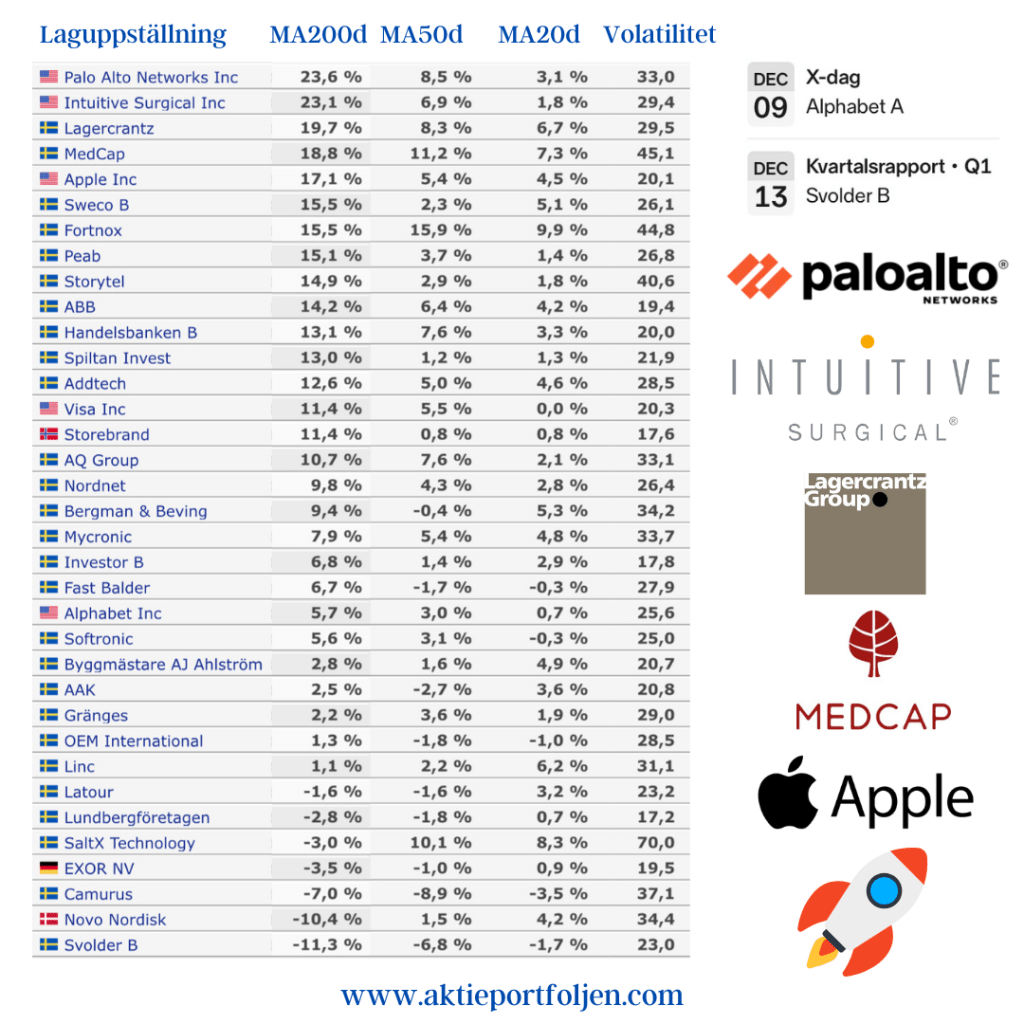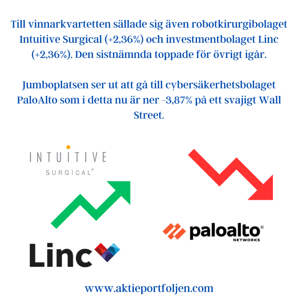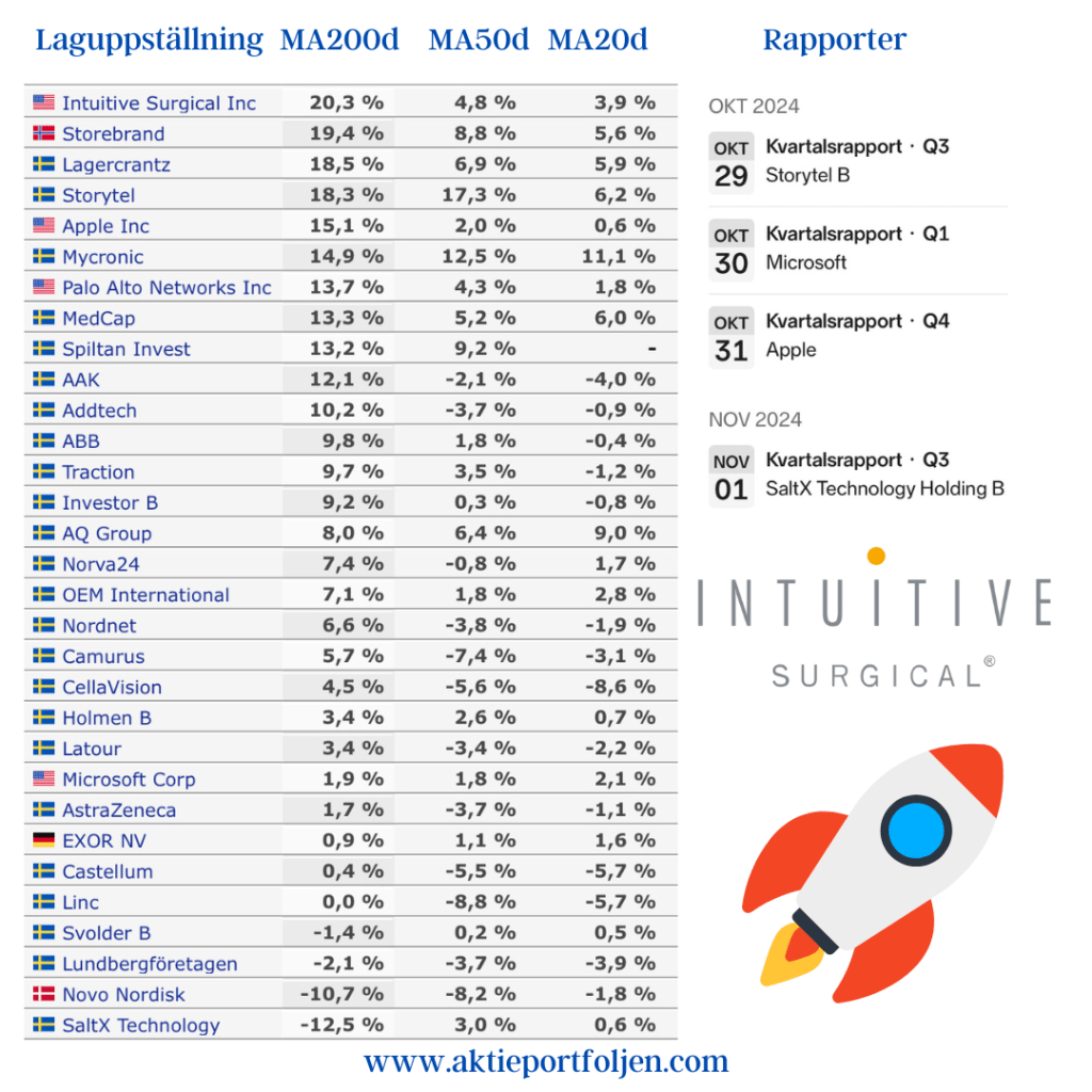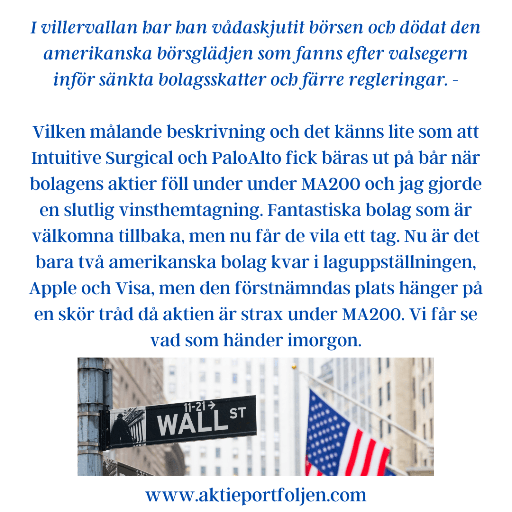 Vilken målande beskrivning och det känns lite som att Intuitive Surgical och PaloAlto fick bäras ut på bår när bolagens aktier föll under under MA200 och jag gjorde en slutlig vinsthemtagning. Fantastiska bolag som är välkomna tillbaka, men nu får de vila ett tag. Nu är det bara två amerikanska bolag kvar i laguppställningen, Apple och Visa, men den förstnämndas plats hänger på en skör tråd då aktien är strax under MA200. Vi får se vad som händer imorgon.