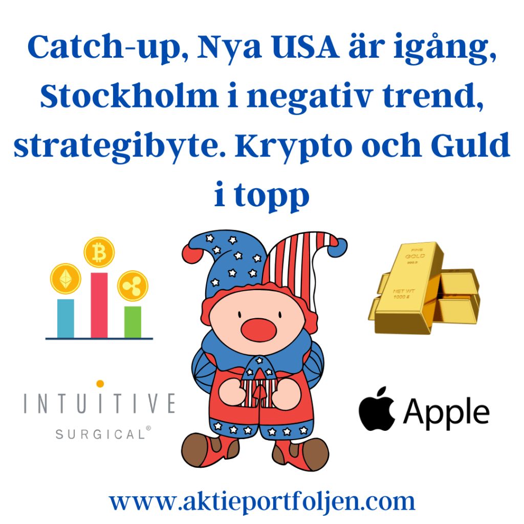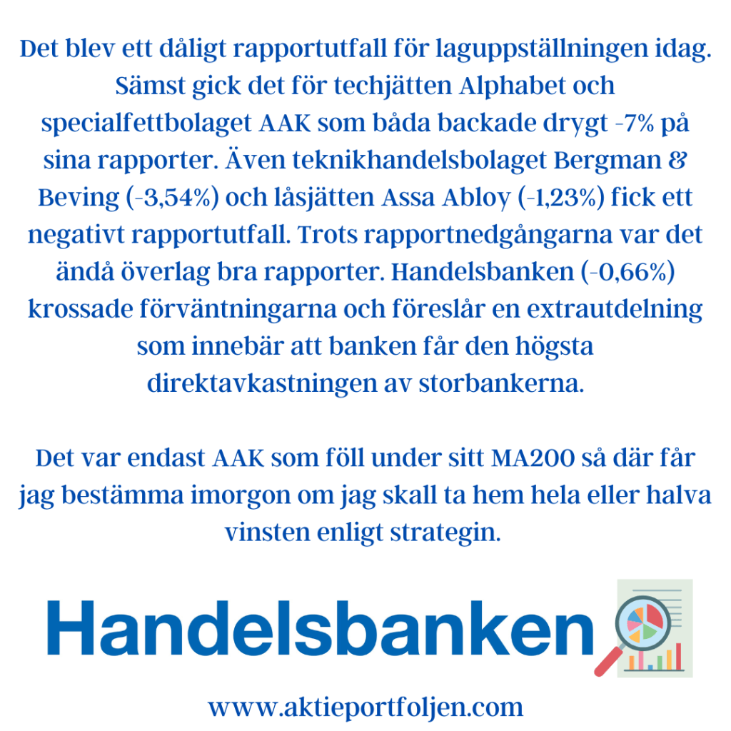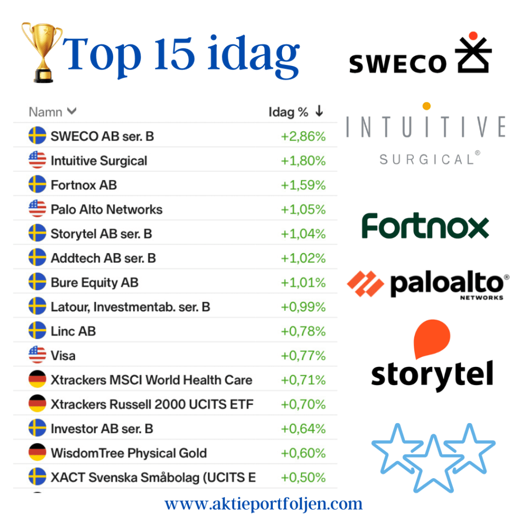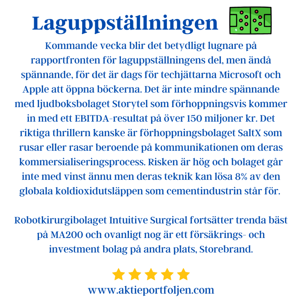 Vilken målande beskrivning och det känns lite som att Intuitive Surgical och PaloAlto fick bäras ut på bår när bolagens aktier föll under under MA200 och jag gjorde en slutlig vinsthemtagning. Fantastiska bolag som är välkomna tillbaka, men nu får de vila ett tag. Nu är det bara två amerikanska bolag kvar i laguppställningen, Apple och Visa, men den förstnämndas plats hänger på en skör tråd då aktien är strax under MA200. Vi får se vad som händer imorgon.