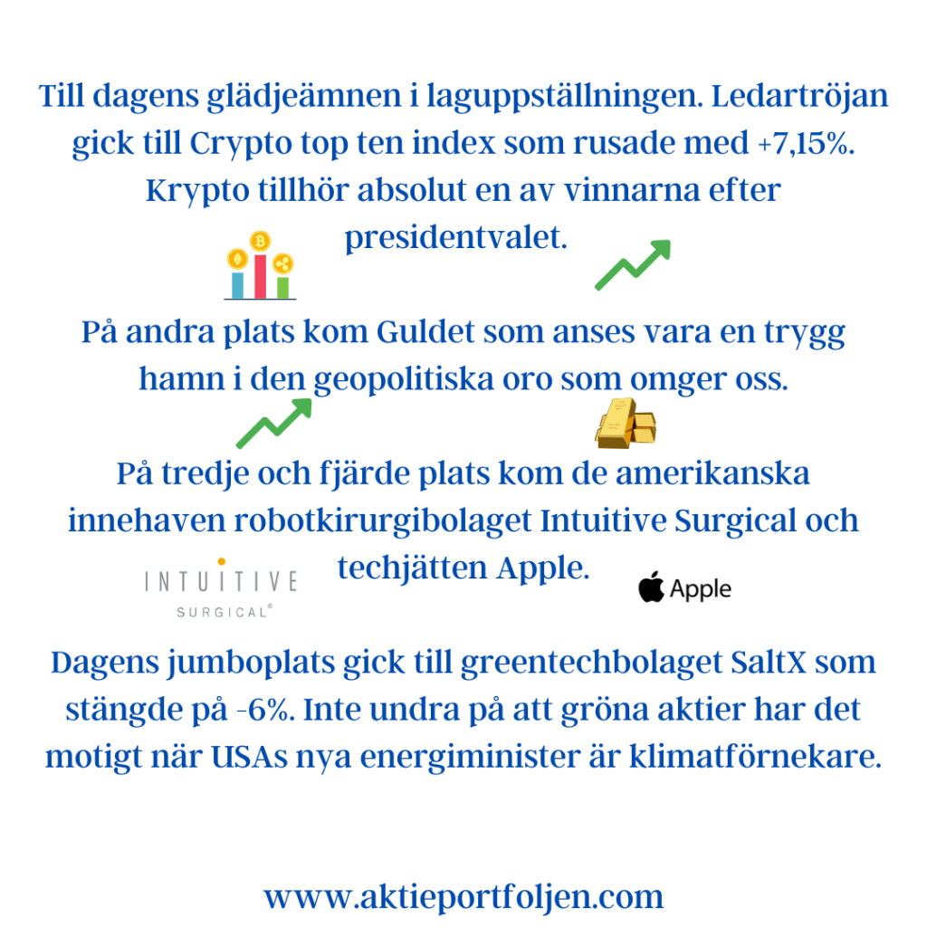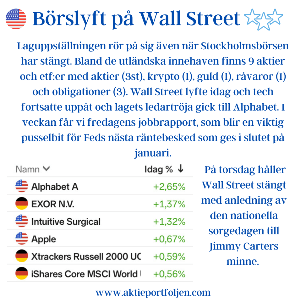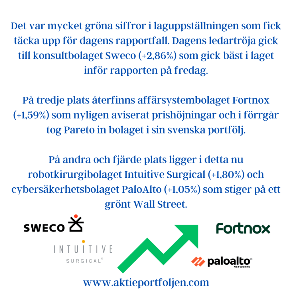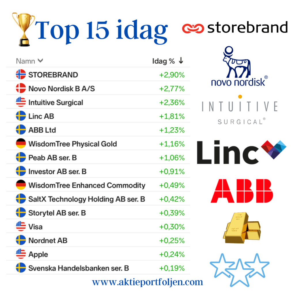 Vilken målande beskrivning och det känns lite som att Intuitive Surgical och PaloAlto fick bäras ut på bår när bolagens aktier föll under under MA200 och jag gjorde en slutlig vinsthemtagning. Fantastiska bolag som är välkomna tillbaka, men nu får de vila ett tag. Nu är det bara två amerikanska bolag kvar i laguppställningen, Apple och Visa, men den förstnämndas plats hänger på en skör tråd då aktien är strax under MA200. Vi får se vad som händer imorgon.