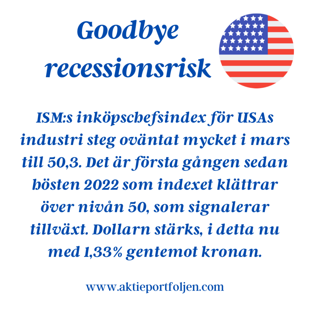 ISM:s inköpschefsindex för USAs industri steg oväntat mycket i mars till 50,3. Det är första gången sedan hösten 2022 som indexet klättrar över nivån 50, som signalerar tillväxt. Dollarn stärks, i detta nu med 1,33% gentemot kronan.