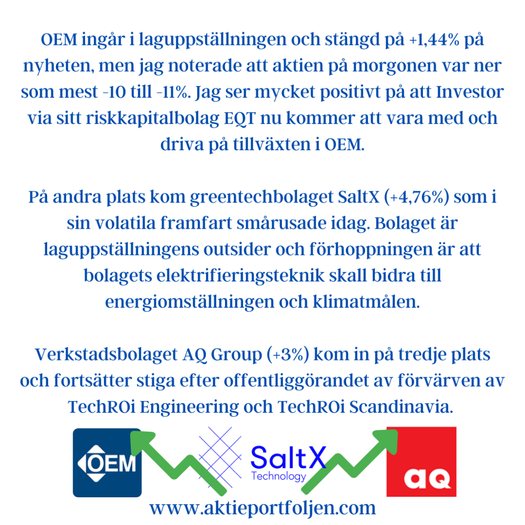 OEM ingår i laguppställningen och stängd på +1,44% på nyheten, men jag noterade att aktien på morgonen var ner som mest -10 till -11%. Jag ser mycket positivt på att Investor via sitt riskkapitalbolag EQT nu kommer att vara med och driva på tillväxten i OEM.