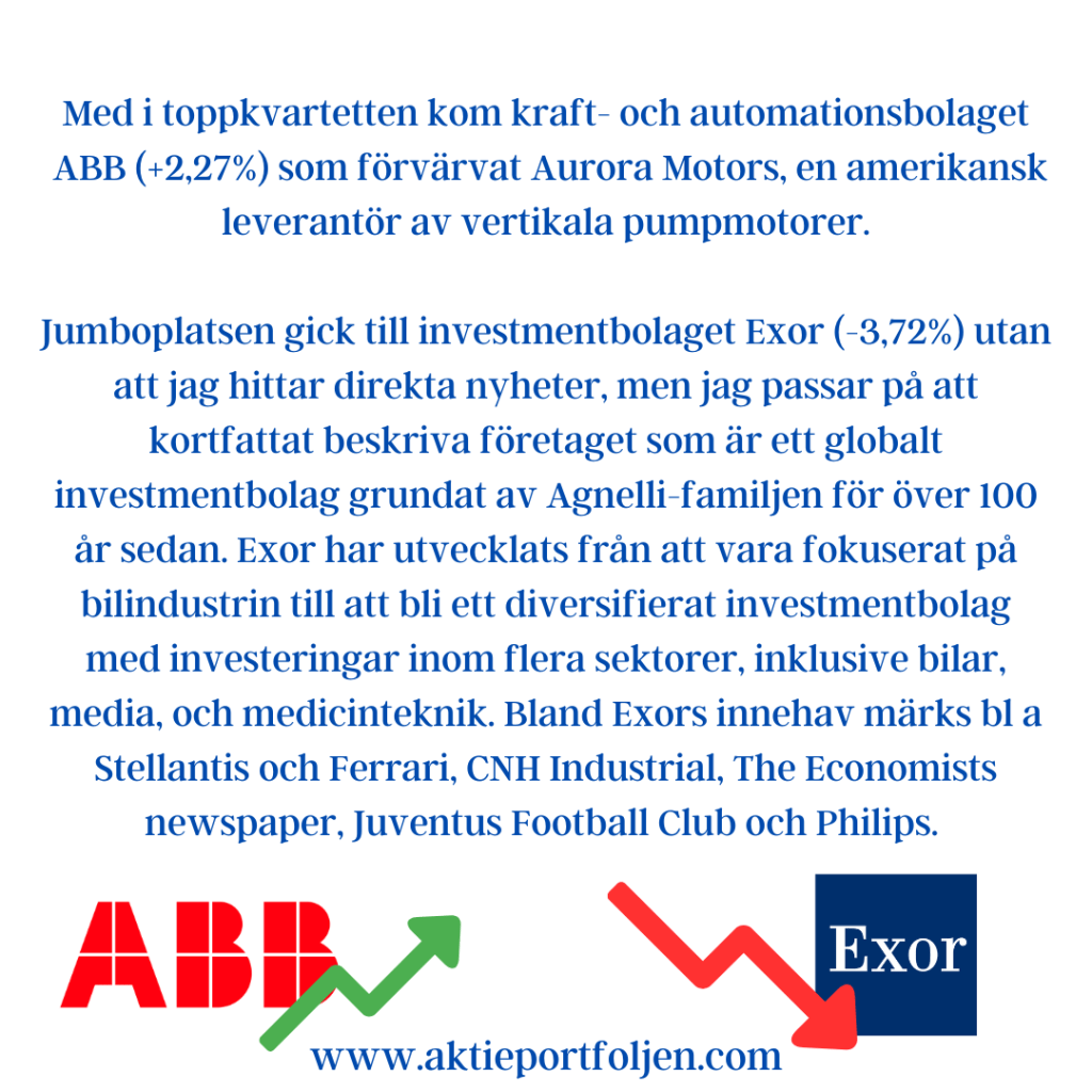 Jumboplatsen gick till investmentbolaget Exor (-3,72%) utan att jag hittar direkta nyheter, men jag passar på att kortfattat beskriva företaget som är ett globalt investmentbolag grundat av Agnelli-familjen för över 100 år sedan. Exor har utvecklats från att vara fokuserat på bilindustrin till att bli ett diversifierat investmentbolag med investeringar inom flera sektorer, inklusive bilar, media, och medicinteknik. Bland Exors innehav märks bl a Stellantis och Ferrari, CNH Industrial, The Economists newspaper, Juventus Football Club och Philips.