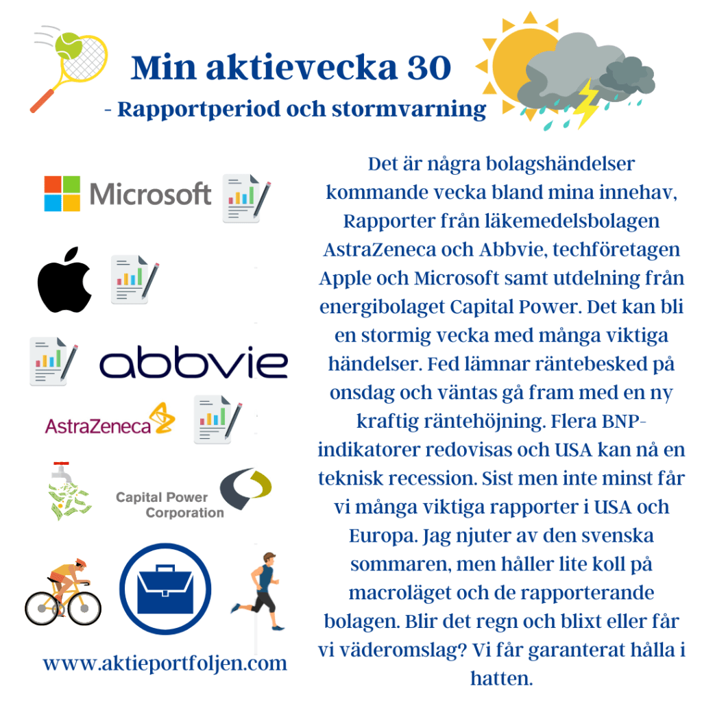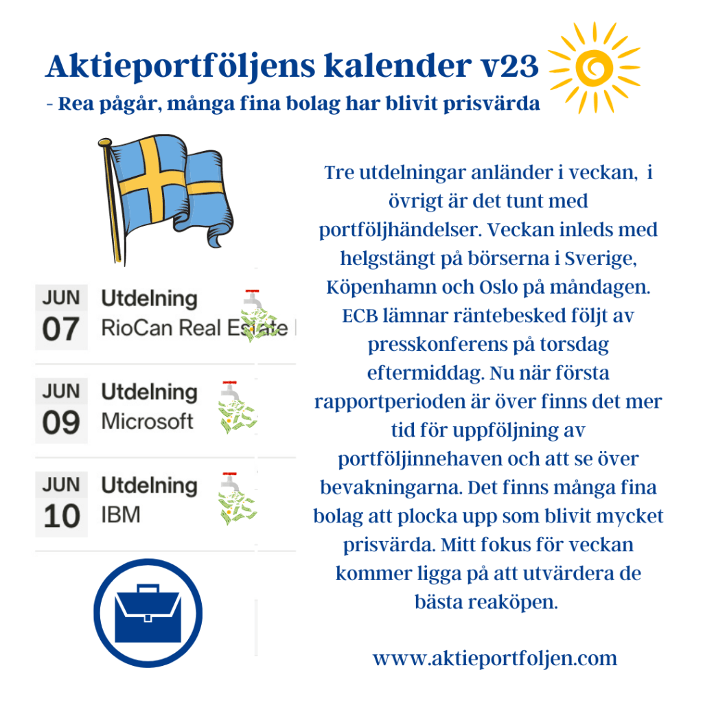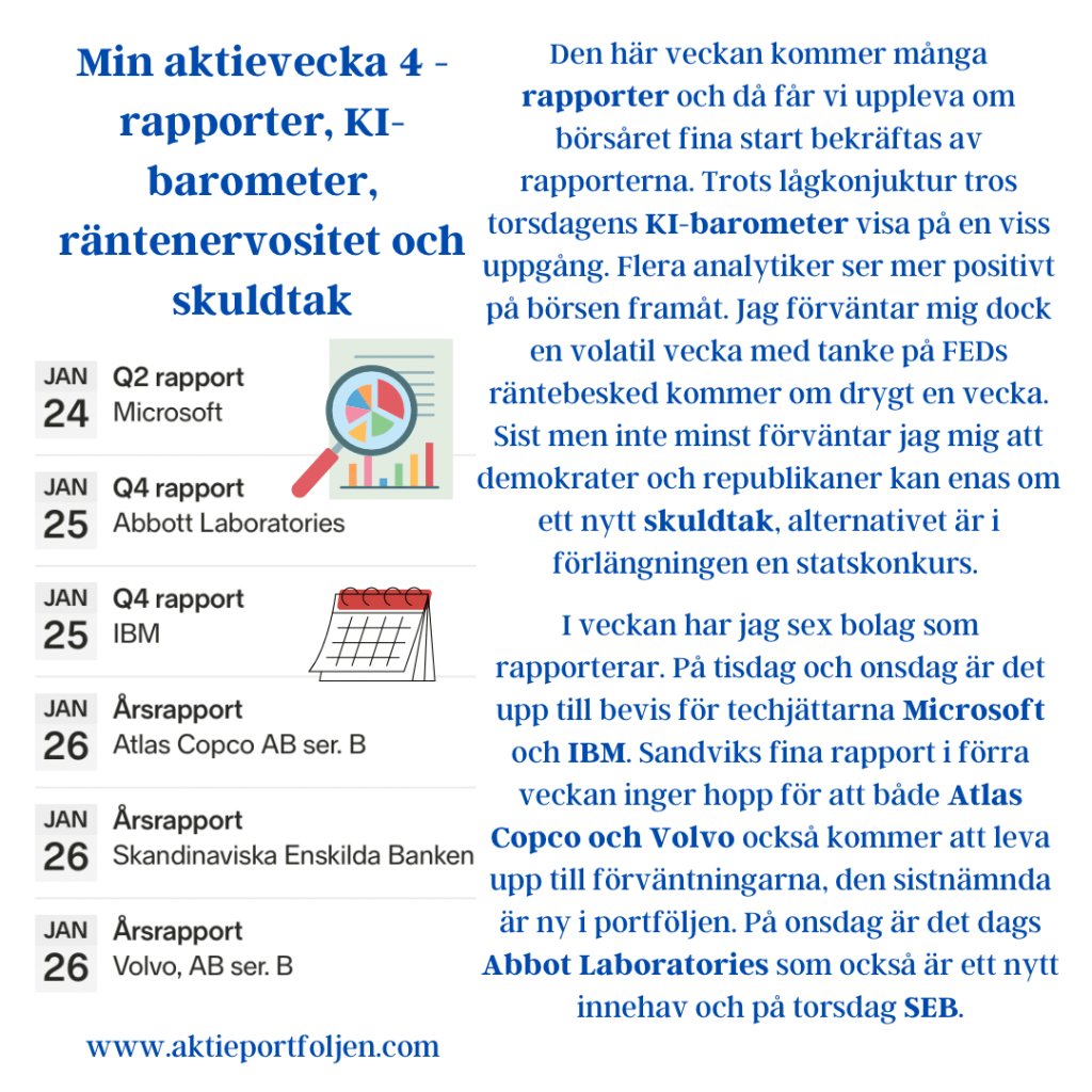 Den här veckan kommer många rapporter och då får vi uppleva om börsåret fina start bekräftas av rapporterna. Trots lågkonjuktur tros torsdagens KI-barometer visa på en viss uppgång. Flera analytiker ser mer positivt på börsen framåt. Jag förväntar mig dock en volatil vecka med tanke på FEDs räntebesked kommer om drygt en vecka. Sist men inte minst förväntar jag mig att demokrater och republikaner kan enas om ett nytt skuldtak, alternativet är i förlängningen en statskonkurs. I veckan har jag sex bolag som rapporterar. På tisdag och onsdag är det upp till bevis för techjättarna Microsoft och IBM. Sandviks fina rapport i förra veckan inger hopp för att både Atlas Copco och Volvo också kommer att leva upp till förväntningarna, den sistnämnda är ny i portföljen. På onsdag är det dags Abbot Laboratories som också är ett nytt innehav och på torsdag SEB.