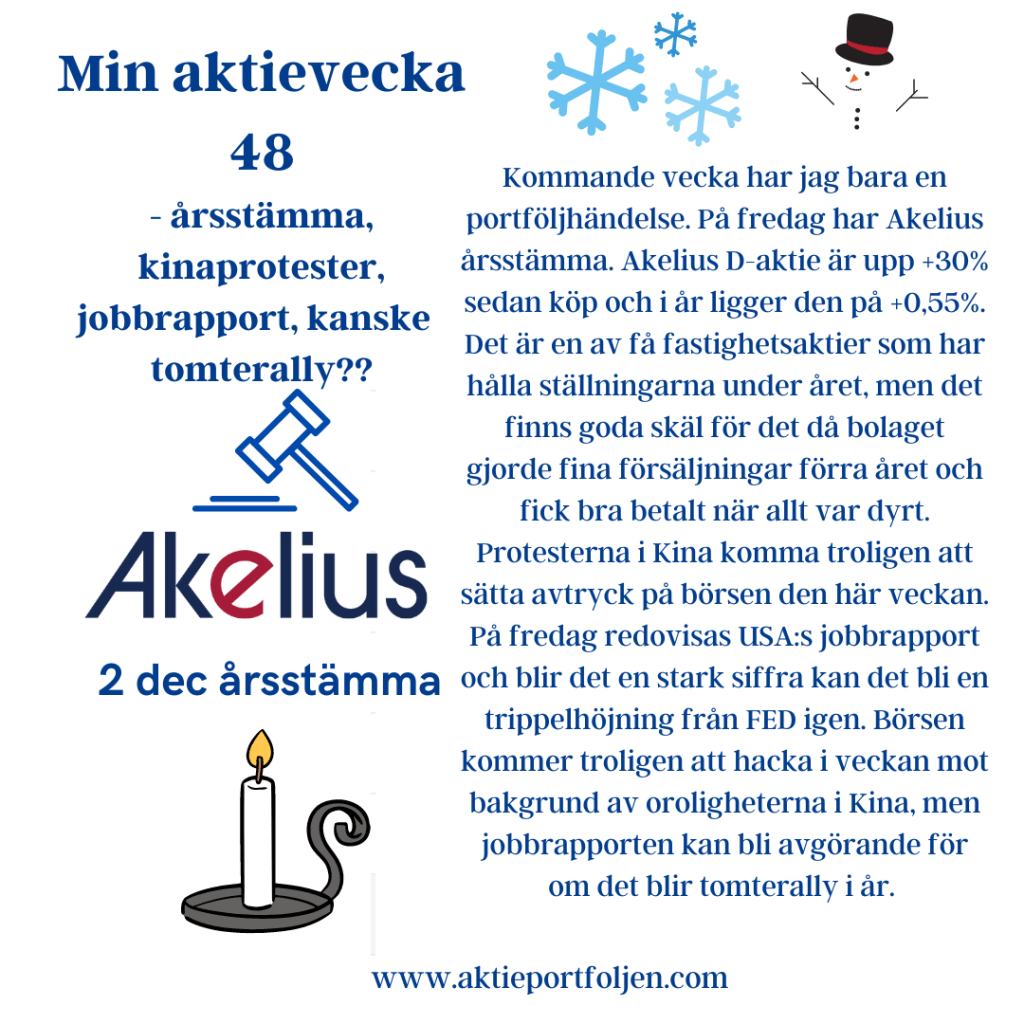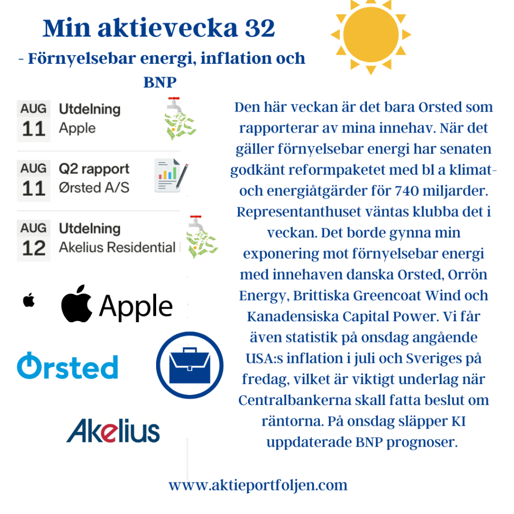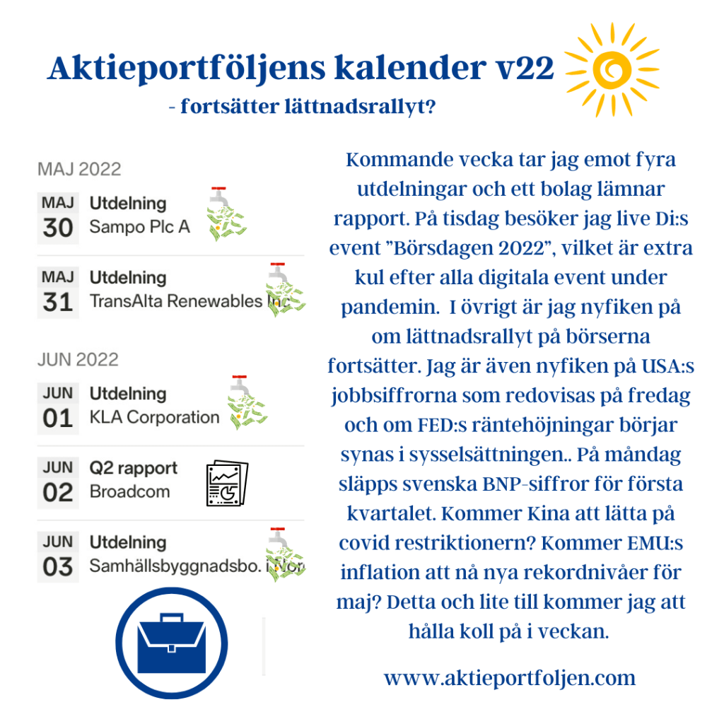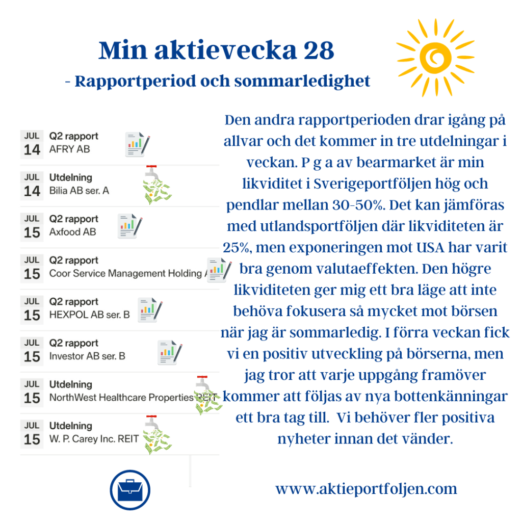 Den här veckan kommer många rapporter och då får vi uppleva om börsåret fina start bekräftas av rapporterna. Trots lågkonjuktur tros torsdagens KI-barometer visa på en viss uppgång. Flera analytiker ser mer positivt på börsen framåt. Jag förväntar mig dock en volatil vecka med tanke på FEDs räntebesked kommer om drygt en vecka. Sist men inte minst förväntar jag mig att demokrater och republikaner kan enas om ett nytt skuldtak, alternativet är i förlängningen en statskonkurs. I veckan har jag sex bolag som rapporterar. På tisdag och onsdag är det upp till bevis för techjättarna Microsoft och IBM. Sandviks fina rapport i förra veckan inger hopp för att både Atlas Copco och Volvo också kommer att leva upp till förväntningarna, den sistnämnda är ny i portföljen. På onsdag är det dags Abbot Laboratories som också är ett nytt innehav och på torsdag SEB.