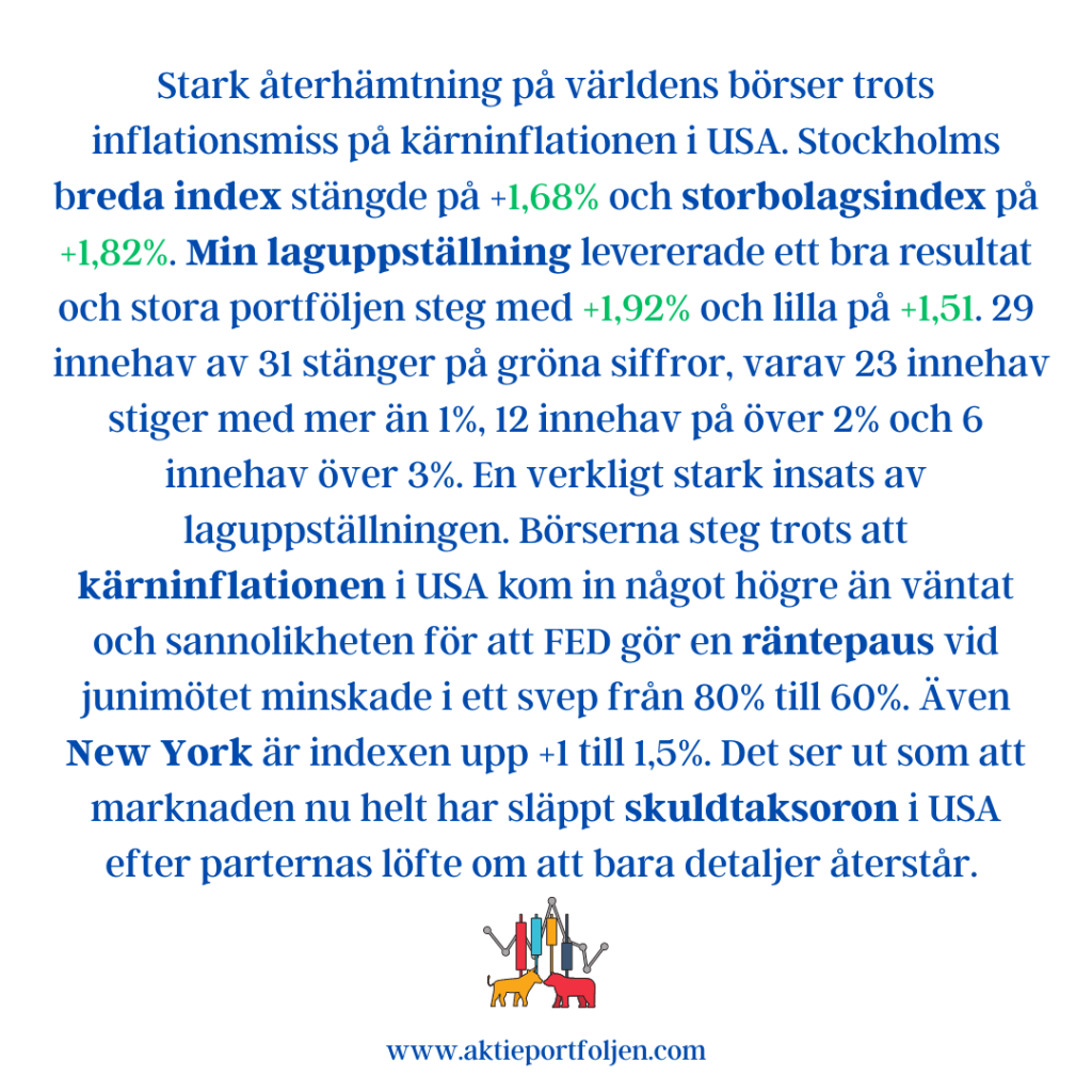 Min laguppställning slår indexen igen och stänger med en fin uppgång. Stockholmsbörsens index stängde på minus och sämst i Europa. Stockholm har verkligen underpresterat i juli och rapportperioden har varit ganska blek i Sverige med dåligt gensvar på oväntat bra rapporter. I USA är det gröna börser vid Europas stängning.