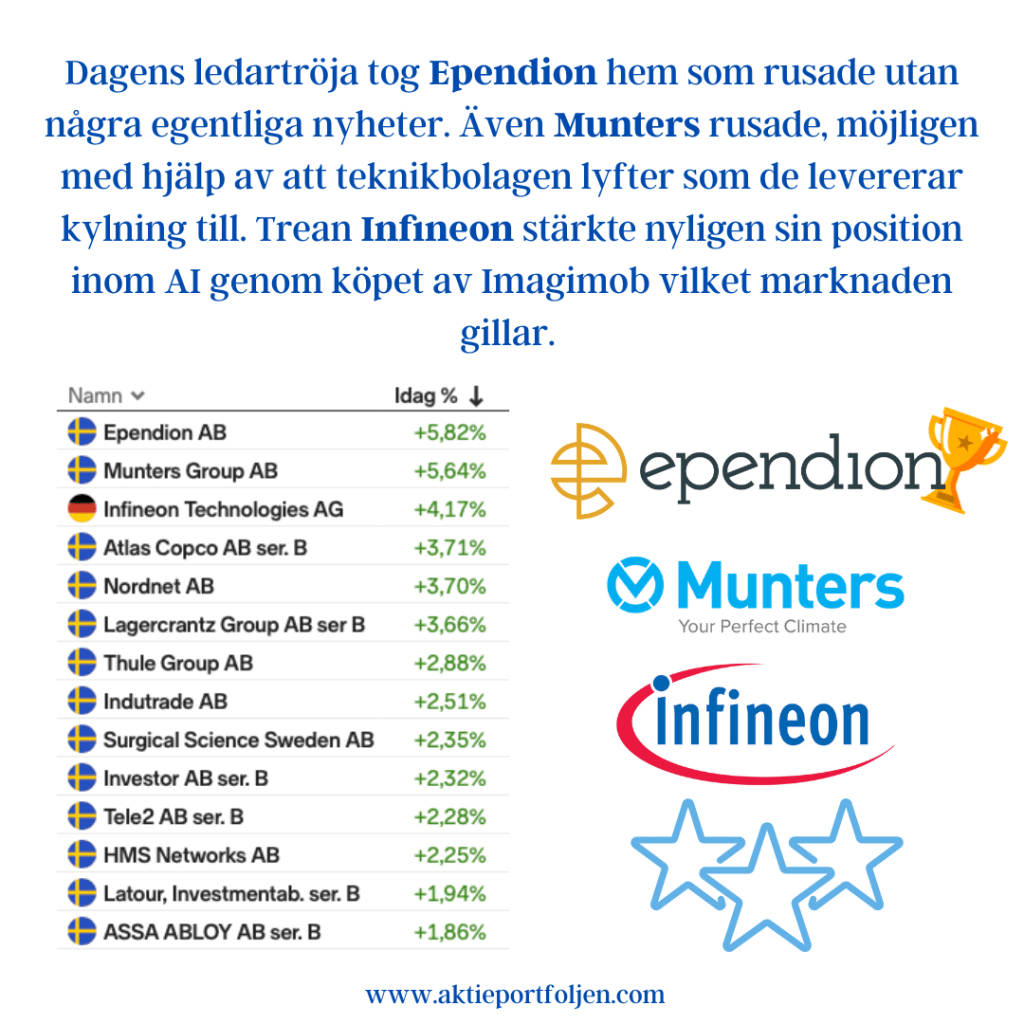 Ledartröjan idag går till läkemedelsjätten Novo Nordisk som nu rullar ut det eftertraktade läkemedlet Wegovy i Europa och som redan gjort succé i USA. Både Infineon och Ependion stänger med en bra uppgång utan direkta nyheter.