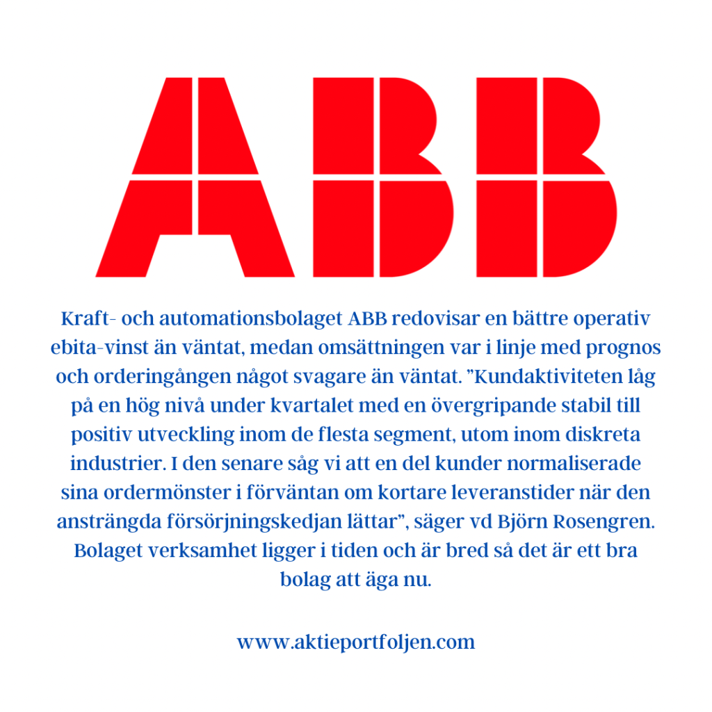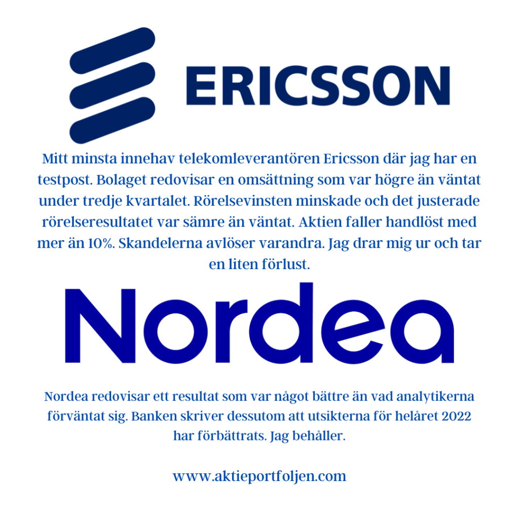 Veckan började bra med en utmärkt rapport från Sandvik och en okej rapport från Getinge. I den senare valde jag att ta hem vinsten. Sedan har några bolag till rapporterat. Mitt största innehav av dessa är det amerikanska teknikbolaget IBM som redovisar en omsättning som var högre än väntat under tredje kvartalet. Det justerade resultatet per aktie var i linje med förväntat. Tech-bjässen bedömer att man kommer att slå sitt tillväxtmål för helåret. Aktien steg 2,9 procent i efterhandeln. Jag behåller och fortsätter att dra nytta av valutaeffekten. Kraft- och automationsbolaget ABB redovisar en bättre operativ ebita-vinst än väntat, medan omsättningen var i linje med prognos och orderingången något svagare än väntat. ”Kundaktiviteten låg på en hög nivå under kvartalet med en övergripande stabil till positiv utveckling inom de flesta segment, utom inom diskreta industrier. I den senare såg vi att en del kunder normaliserade sina ordermönster i förväntan om kortare leveranstider när den ansträngda försörjningskedjan lättar”, säger vd Björn Rosengren. Bolaget verksamhet ligger i tiden och är bred så det är ett bra bolag att äga nu. Mitt minsta innehav telekomleverantören Ericsson där jag har en testpost. Bolaget redovisar en omsättning som var högre än väntat under tredje kvartalet. Rörelsevinsten minskade och det justerade rörelseresultatet var sämre än väntat. Aktien faller handlöst med mer än 10%. Skandelerna avlöser varandra. Jag drar mig ur och tar en liten förlust. Nordea redovisar ett resultat som var något bättre än vad analytikerna förväntat sig. Banken skriver dessutom att utsikterna för helåret 2022 har förbättrats. Jag behåller.