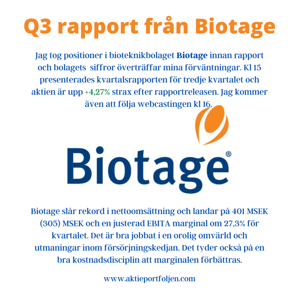 Jag tog positioner i bioteknikbolaget Biotage innan rapport och bolagets siffror överträffar mina förväntningar. Kl 15 presenterades kvartalsrapporten för tredje kvartalet och aktien är upp +4,27% strax efter rapportreleasen. Jag kommer även att följa webcastingen kl 16. Biotage slår rekord i nettoomsättning och landar på 401 MSEK (305) MSEK och en justerad EBITA marginal om 27,3% för kvartalet. Det är bra jobbat i en orolig omvärld och utmaningar inom försörjningskedjan. Det tyder också på en bra kostnadsdisciplin att marginalen förbättras. Samtliga tre kundfokusområden uppvisar stark tillväxt under kvartalet jämfört med motsvarande period föregående år; White Tech med kunder verksamma inom forskning, utveckling och tillverkning av läkemedel och vaccin, Red Tech med fokus på diagnostikföretag och kliniska, kriminaltekniska och dopinglaboratorier samt Blue & Green Tech inriktat på miljö-, vatten- och livsmedelslaboratorier. Sammantaget är den organiska tillväxt under årets tredje kvartal 12,2 procent.
