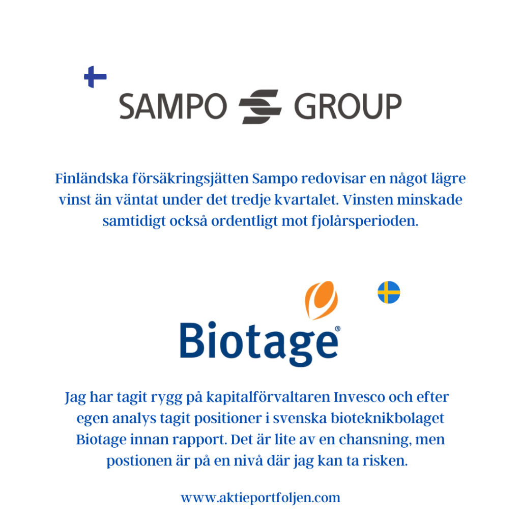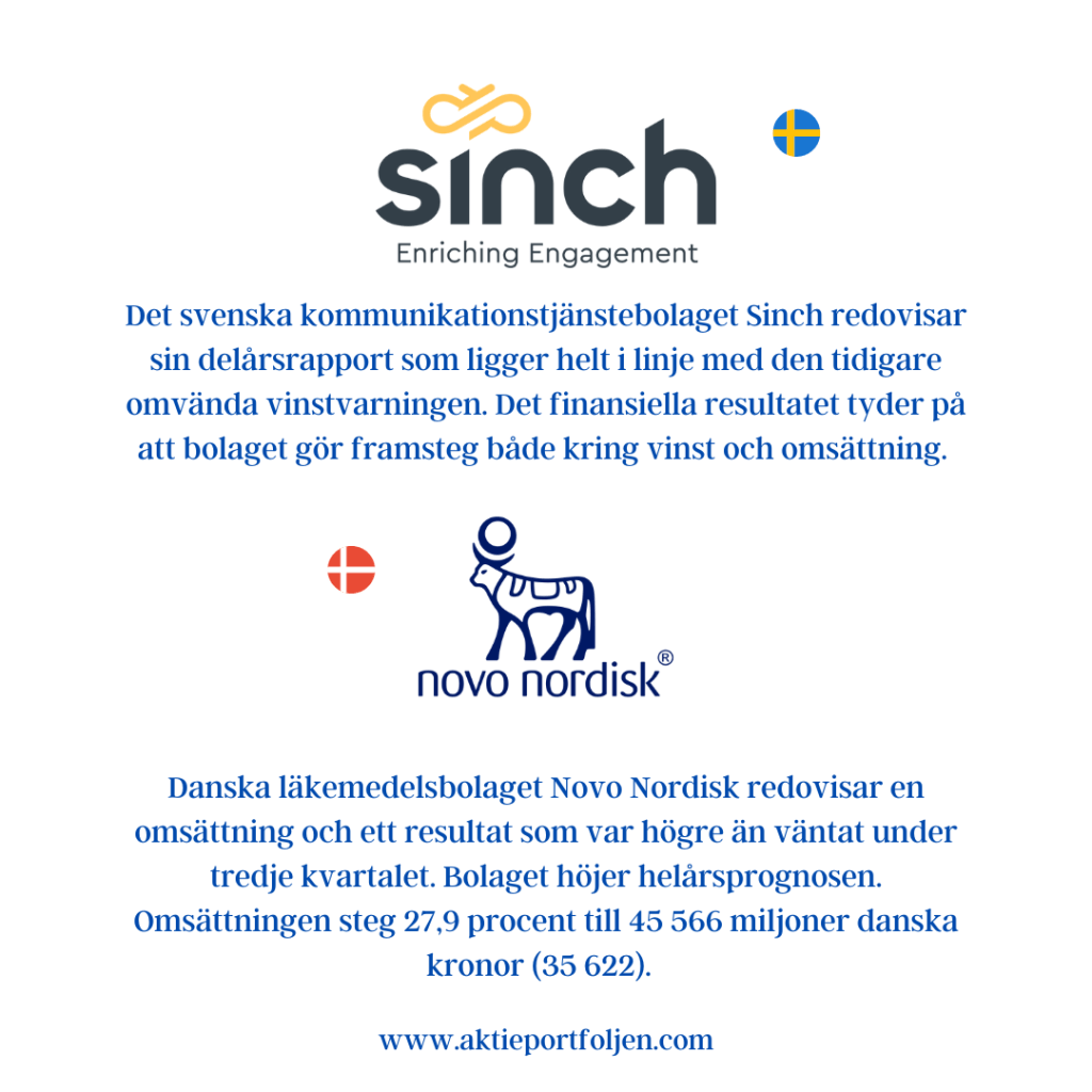 Bland mina innehav rapporterar idag Sinch, Novo Nordisk, Sampo och något senare idag kl 16 mitt nya innehav Biotage. Sinch rusar igen, i detta nu, med +31,28% och Novo Nordisk gör en normal rusning med +4,82%. Sampo däremot gör ett magplask och är ner -5,48%. Biotage stiger inför rapport med +1,55%. Det är kul med bearmarketrally, men jag är överviktad i hedge för fortsatt nedgång på börsen. Jag undviker att bli alltför optimistisk och ta för stora positioner. Ikväll kl 19 får vi troligen svart på vitt om FED höjer räntan med ytterligare 0,75 punkter, allt annat är en överraskning. Det svenska kommunikationstjänstebolaget Sinch redovisar sin delårsrapport som ligger helt i linje med den tidigare omvända vinstvarningen. Det finansiella resultatet tyder på att bolaget gör framsteg både kring vinst och omsättning. Danska läkemedelsbolaget Novo Nordisk redovisar en omsättning och ett resultat som var högre än väntat under tredje kvartalet. Bolaget höjer helårsprognosen.Omsättningen steg 27,9 procent till 45 566 miljoner danska kronor (35 622). Finländska försäkringsjätten Sampo redovisar en något lägre vinst än väntat under det tredje kvartalet. Vinsten minskade samtidigt också ordentligt mot fjolårsperioden. Jag har tagit rygg på kapitalförvaltaren Invesco och efter egen analys tagit positioner i svenska bioteknikbolaget Biotage innan rapport. Det är lite av en chansning, men postionen är på en nivå där jag kan ta risken.