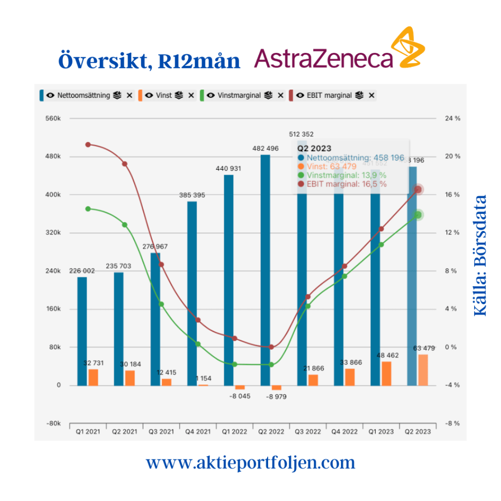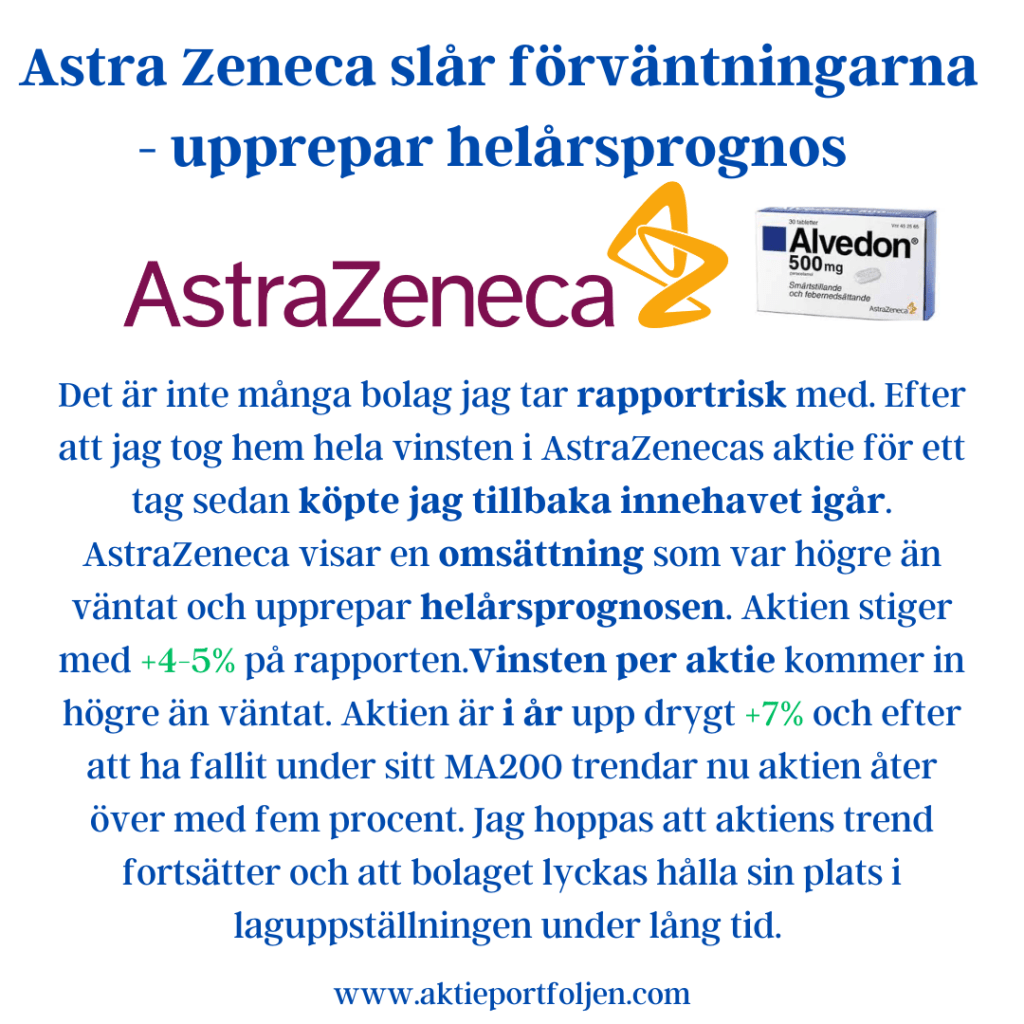 Det är inte många bolag jag tar rapportrisk med. Efter att jag tog hem hela vinsten i AstraZenecas aktie för ett tag sedan köpte jag tillbaka innehavet igår. AstraZeneca visar en omsättning som var högre än väntat och upprepar helårsprognosen. Aktien stiger med +4-5% på rapporten.Vinsten per aktie kommer in högre än väntat. Aktien är i årupp drygt +7% och efter att ha fallit under sitt MA200 trendar nu aktien åter över med fem procent. Jag hoppas att aktiens trend fortsätter och att bolaget lyckas hålla sin plats i laguppställningen under lång tid.