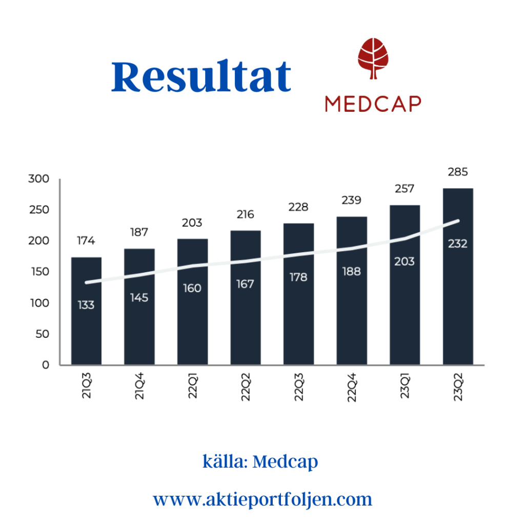 Försäljningen ökade med 36 procent, till 386,1 (284,1) MSEK under årets andra kvartal. Tillväxten drevs delvis av förvärvet av AdderaCare som tillträdes 2 januari 2023, men även en stark organisk tillväxt i flera av koncernens bolag, vilket främst förklaras av nya produkter i marknaden, utlicensiering till fler marknader, samt en ökad efterfrågan på befintliga produkter. EBITDA ökade med 46 procent till 86,6 (59,4) MSEK under årets andra kvartal. Resultatet påverkades positivt av den försäljningstillväxt som skedde under kvartalet samt en stärkt bruttomarginal till följd av positiv produktmix i flera av koncernens bolag.EBITDA-marginalen uppgick till 22 (21) procent. (Medcap)