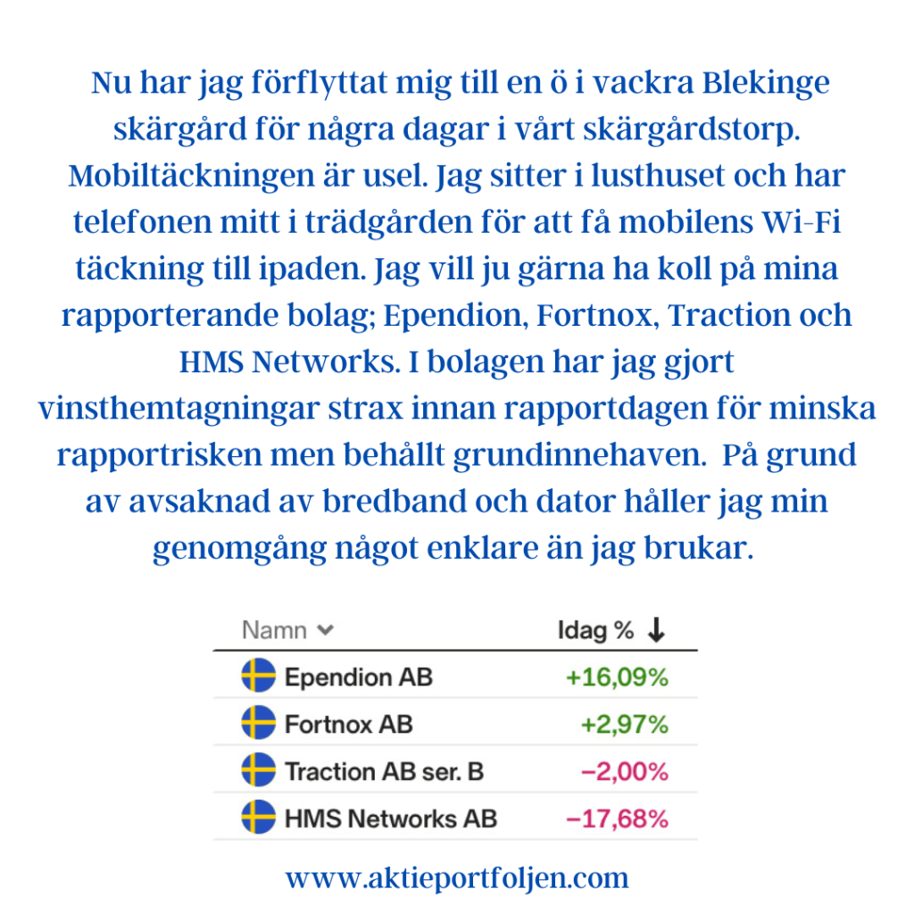 Nu har jag förflyttat mig till en ö i vackra Blekinge skärgård för några dagar i vårt skärgårdstorp. Mobiltäckningen är usel. Jag sitter i lusthuset och har telefonen mitt i trädgården för att få mobilens Wi-Fi täckning till ipaden. Jag vill ju gärna ha koll på mina rapporterande bolag; Ependion, Fortnox, Traction och HMS Networks. I bolagen har jag gjort vinsthemtagningar strax innan rapportdagen för minska rapportrisken men behållt grundinnehaven. På grund av avsaknad av bredband och dator håller jag min genomgång något enklare än jag brukar. Om jag börjar från botten hade jag ställt in en stoploss på HMS Networks som inte fungerade då aktien föll som en gråsten eftersom resultatet inte levde upp till förväntningarna. Aktien är i detta nu ner -18% och har dessutom fallit under sitt MA200. Enligt min regelbok förpassas den då omedelbart till avbytarbänken. Traction minskade substansvärdet med en procent medan SBX indexet steg med tre procent. Aktien är i detta nu ned -2% men handlas fortfarande sex procent över sitt MA200. Det är bra och min regelbok tillåter mig att hålla investmentbolag som både är under och över sitt MA200. Traction får vara kvar på plan. Nu till mina positiva rapportörer. Fortnox fortsätter att visa imponerande resultat under det andra kvartalet 2023. Företagets rörelseresultat har ökat med hela 52 procent jämfört med samma kvartal föregående år och uppgår nu till 157 miljoner kronor. Aktien är i detta nu upp +3% och förstärker sin fina trend och plats i laget. Jag avslutar med dagens rapportvinnare. Ependion redovisar rekordstarka intäkter, resultat och orderingång. Aktien är just nu upp drygt +16% och befäster sin fina trend och plats i laguppställningen