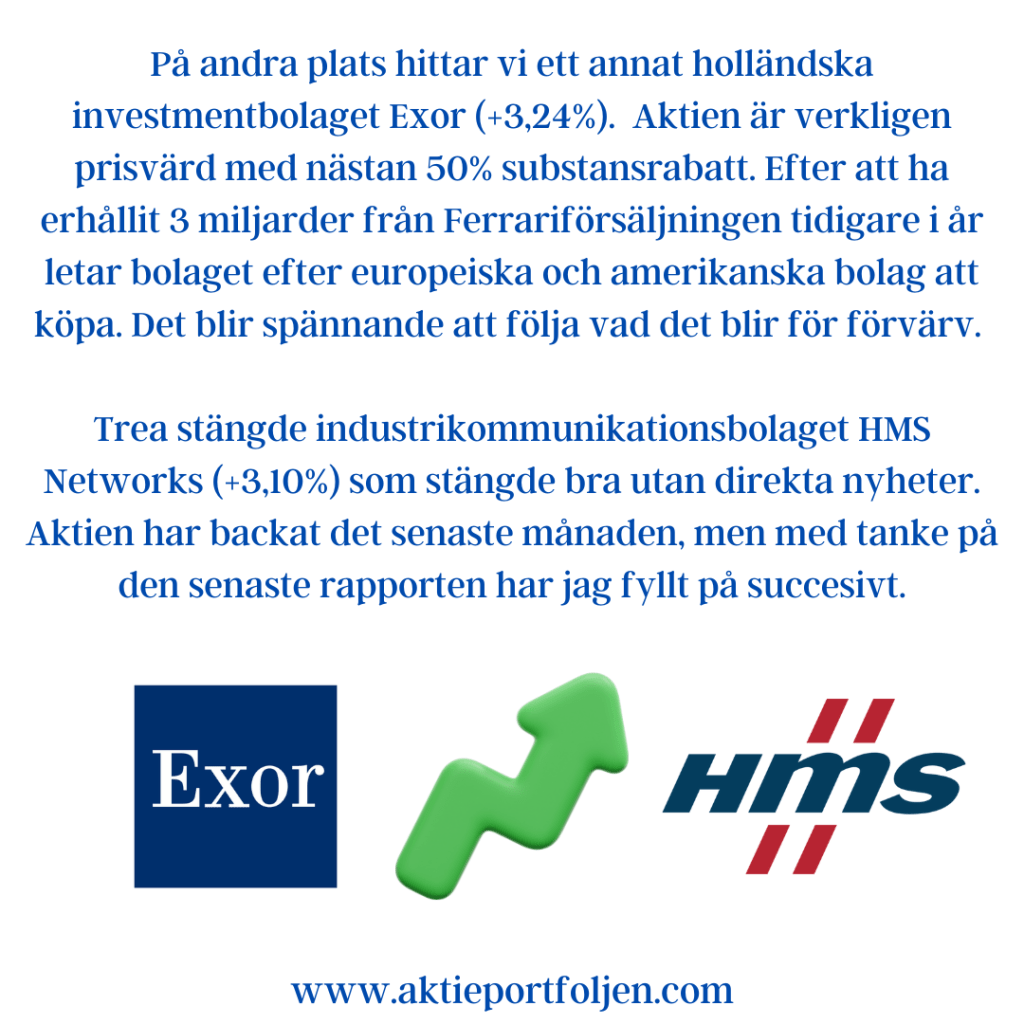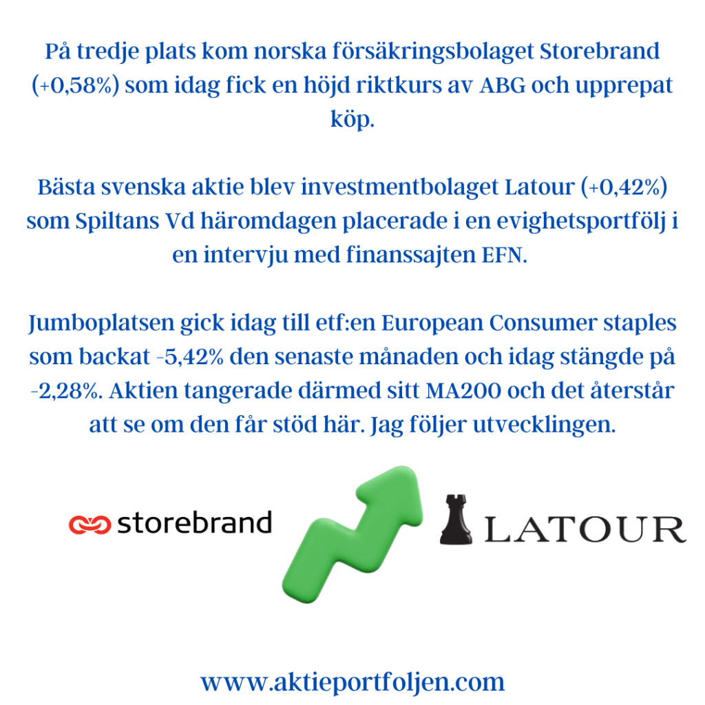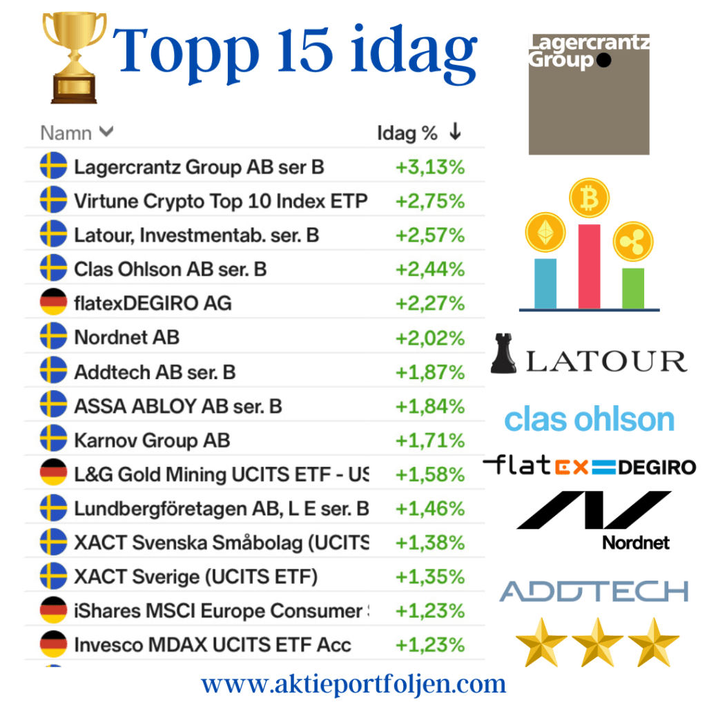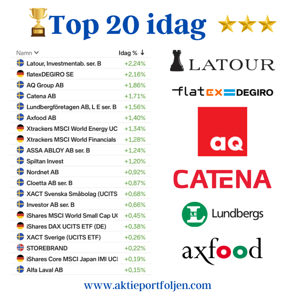 Latour, Investmentab. ser. B +2,24 % flatexDEGIRO SE +2,16 % AQ Group AB +1,86 % Catena AB +1,71 % Lundbergföretagen AB, L E ser. B +1,56 % Axfood AB +1,40 % Xtrackers MSCI World Energy UCITS ETF +1,34 % Xtrackers MSCI World Financials UCITS ETF +1,28 % ASSA ABLOY AB ser. B +1,24 % Spiltan Invest +1,20 % Nordnet AB +0,92 % Cloetta AB ser. B +0,87 % XACT Svenska Småbolag (UCITS ETF) +0,68 % Investor AB ser. B +0,66 % iShares MSCI World Small Cap UCITS ETF +0,45 % iShares DAX UCITS ETF (DE) +0,38 % XACT Sverige (UCITS ETF) +0,26 % Storebrand +0,22 % iShares Core MSCI Japan IMI UCITS ETF +0,19 % Alfa Laval AB +0,15 %