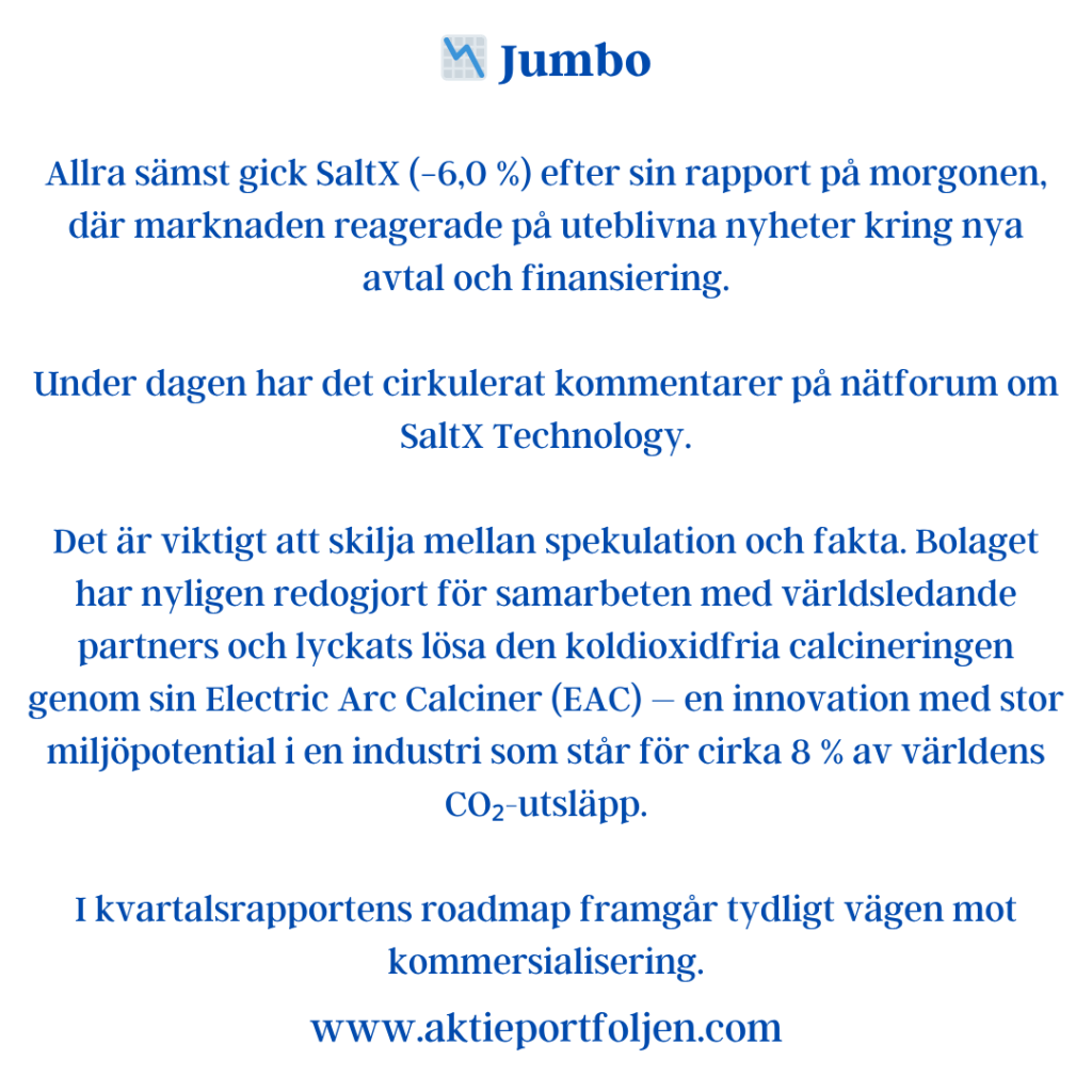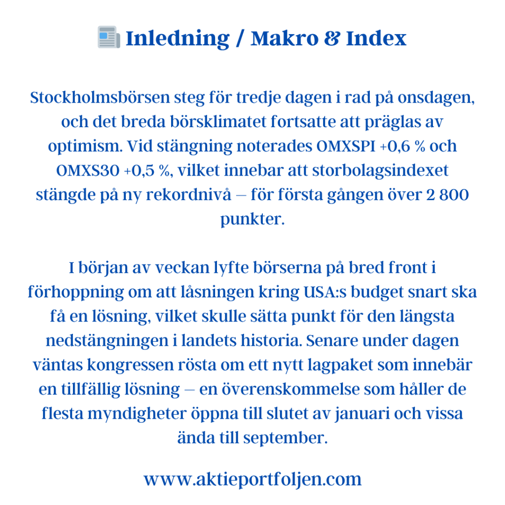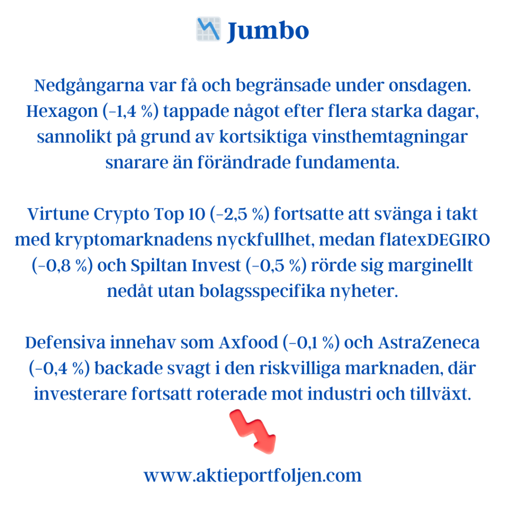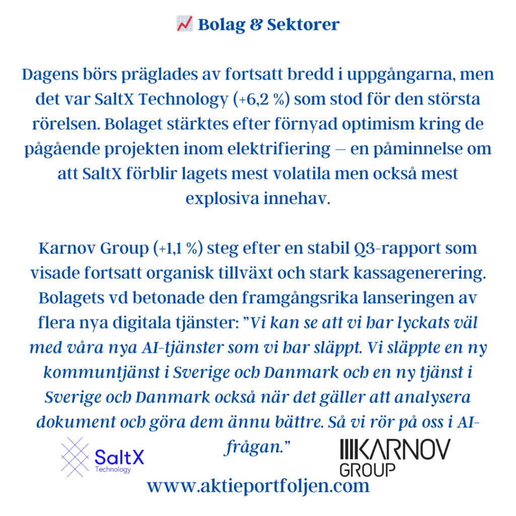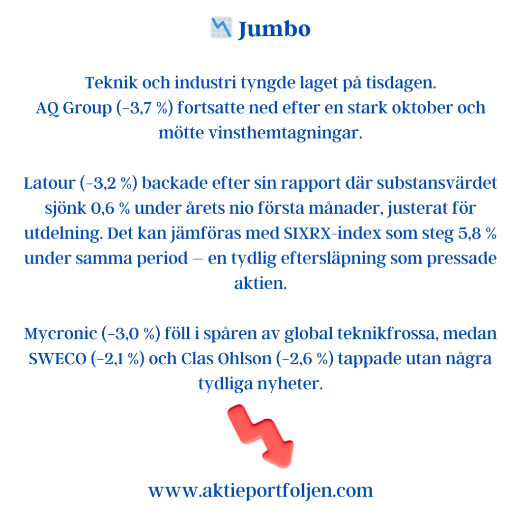 Stödet förstärktes ytterligare av att Latours största innehav, Nederman, steg med över 4 procent under dagen. Även i Nederman har det nyligen förekommit insynsaktivitet, vilket sammantaget bidrog till ett stärkt sentiment kring Latour och en positiv syn på substansvärdet.