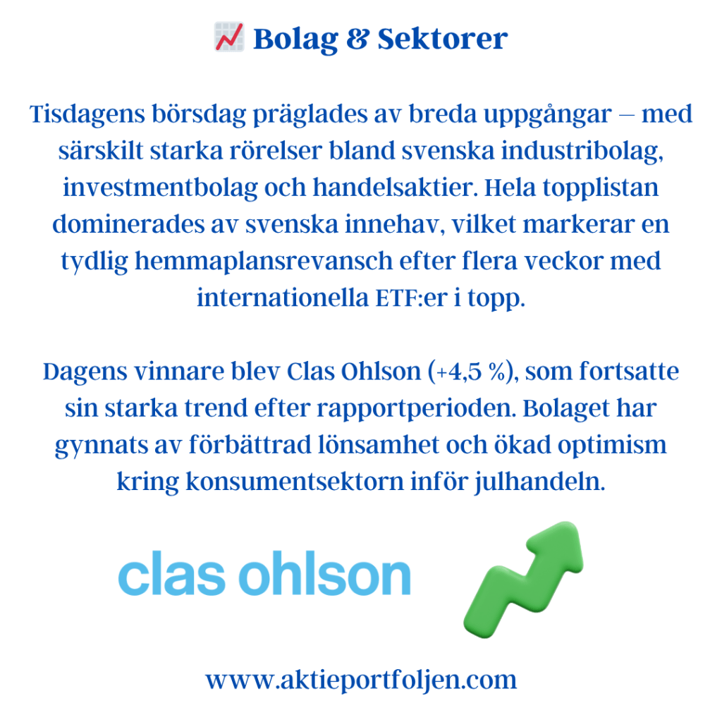 Latour hörde till dagens tydligare vinnare efter att omfattande insynsköp uppmärksammats i bolaget. Flera nyckelpersoner har nyligen förvärvat betydande aktieposter, däribland styrelseledamöterna Eric och Carl Douglas ur den kontrollerande familjen samt styrelseordförande Johan Nordström. Insynshandeln tolkas som en tydlig förtroendesignal från såväl ledning som huvudägare kring Latours långsiktiga värdeskapande.