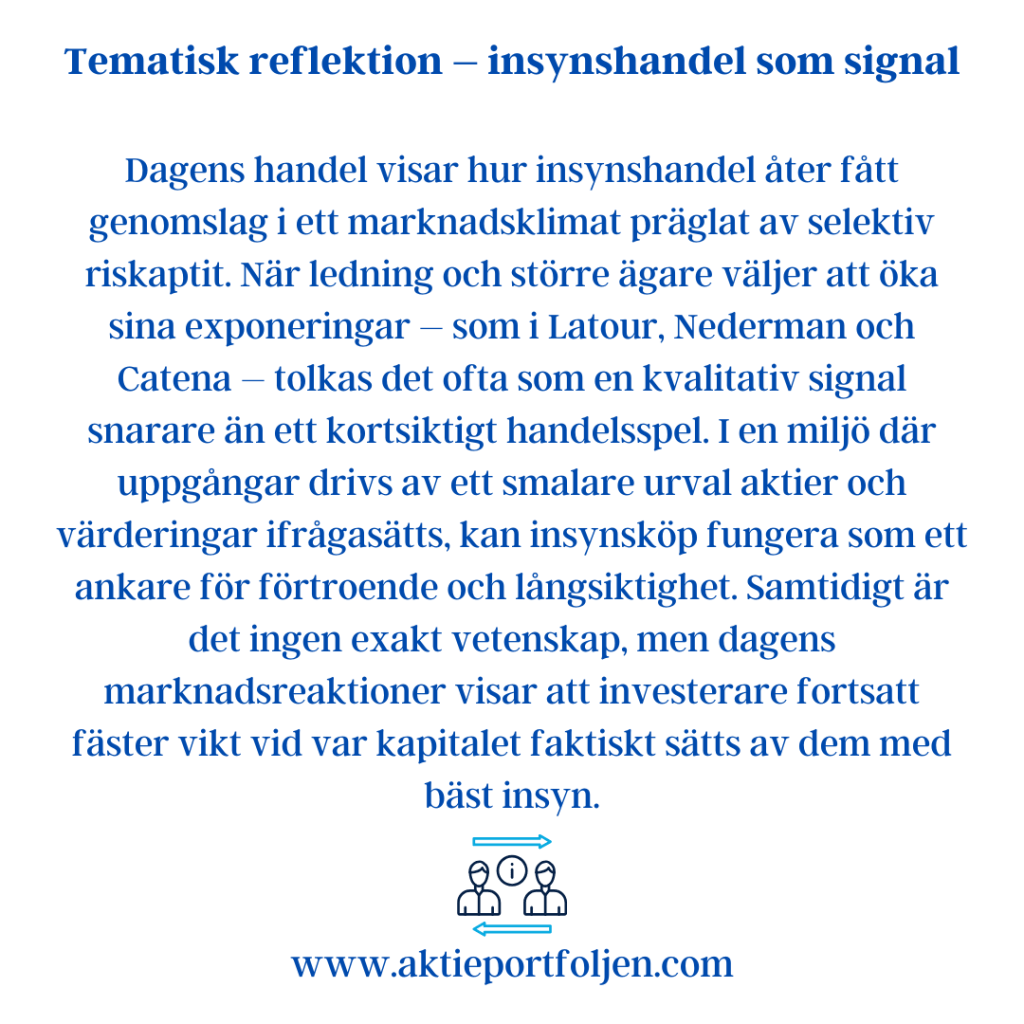 Dagens handel visar hur insynshandel åter fått genomslag i ett marknadsklimat präglat av selektiv riskaptit. När ledning och större ägare väljer att öka sina exponeringar – som i Latour, Nederman och Catena – tolkas det ofta som en kvalitativ signal snarare än ett kortsiktigt handelsspel. I en miljö där uppgångar drivs av ett smalare urval aktier och värderingar ifrågasätts, kan insynsköp fungera som ett ankare för förtroende och långsiktighet. Samtidigt är det ingen exakt vetenskap, men dagens marknadsreaktioner visar att investerare fortsatt fäster vikt vid var kapitalet faktiskt sätts av dem med bäst insyn.