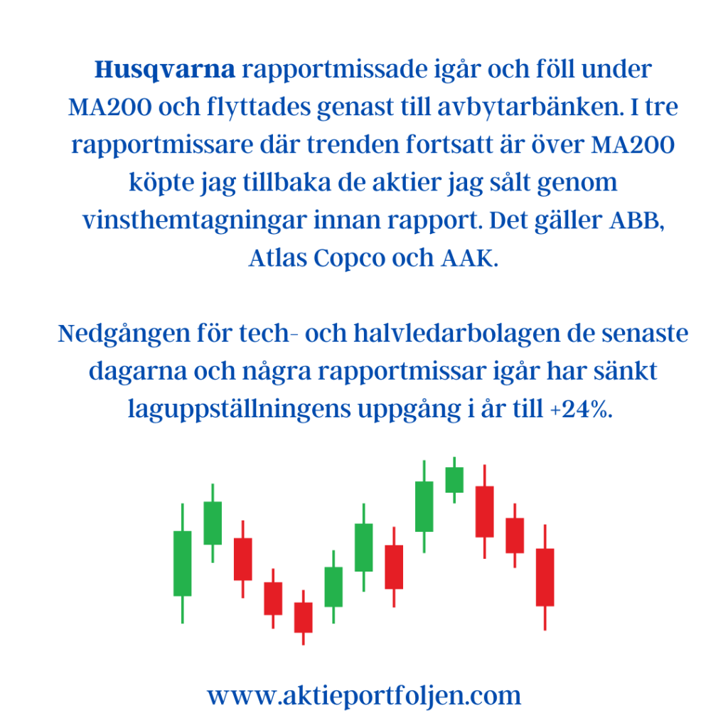 Jag har plockat in Thule i laguppställningen vars aktie ser ut att stärka sin trend. Jag fyller på mer om trenden fortsätter stärkas. Förhoppningsvis är det läge nu inför att fortsatta räntesänkningar kommer att stärka konsumenterna.