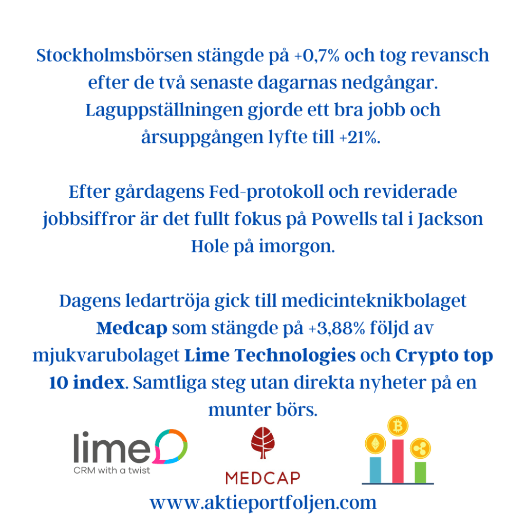 Stockholmsbörsen stängde på +0,7% och tog revansch efter de två senaste dagarnas nedgångar. Laguppställningen gjorde ett bra jobb och årsuppgången lyfte till +21%.