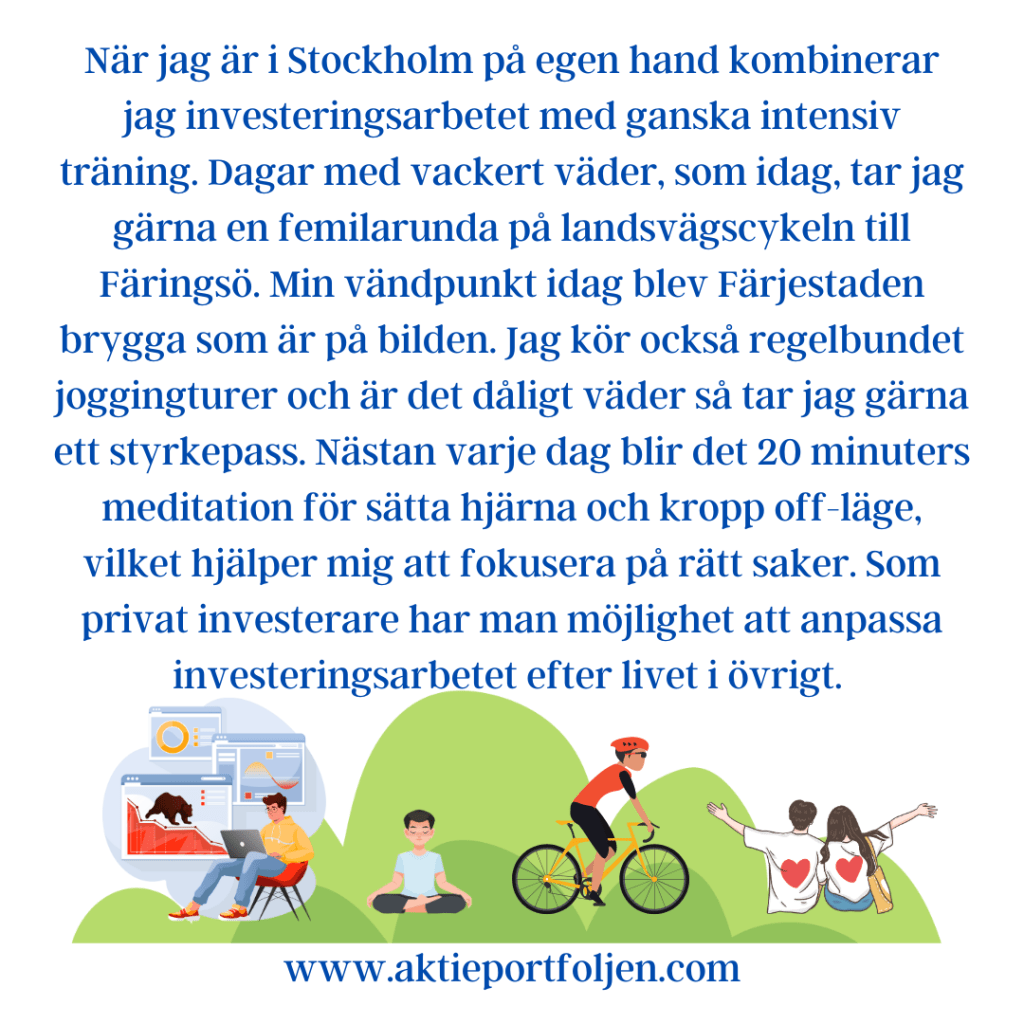 När jag är i Stockholm på egen hand kombinerar jag investeringsarbetet med ganska intensiv träning. Dagar med vackert väder, som idag, tar jag gärna en femilarunda på landsvägscykeln till Färingsö. Min vändpunkt idag blev Färjestaden brygga som är på bilden. Jag kör också regelbundet joggingturer och är det dåligt väder så tar jag gärna ett styrkepass. Nästan varje dag blir det 20 minuters meditation för sätta hjärna och kropp off-läge, vilket hjälper mig att fokusera på rätt saker. Som privat investerare har man möjlighet att anpassa investeringsarbetet efter livet i övrigt.