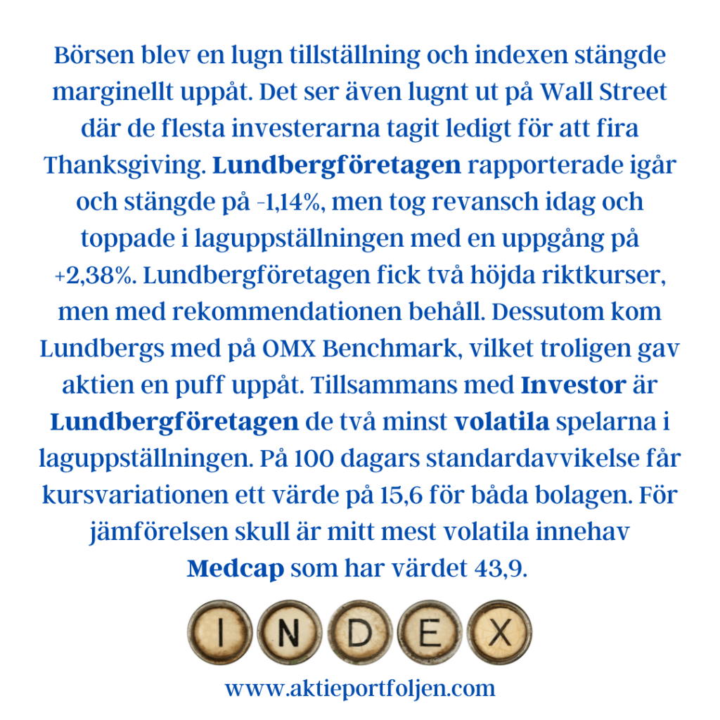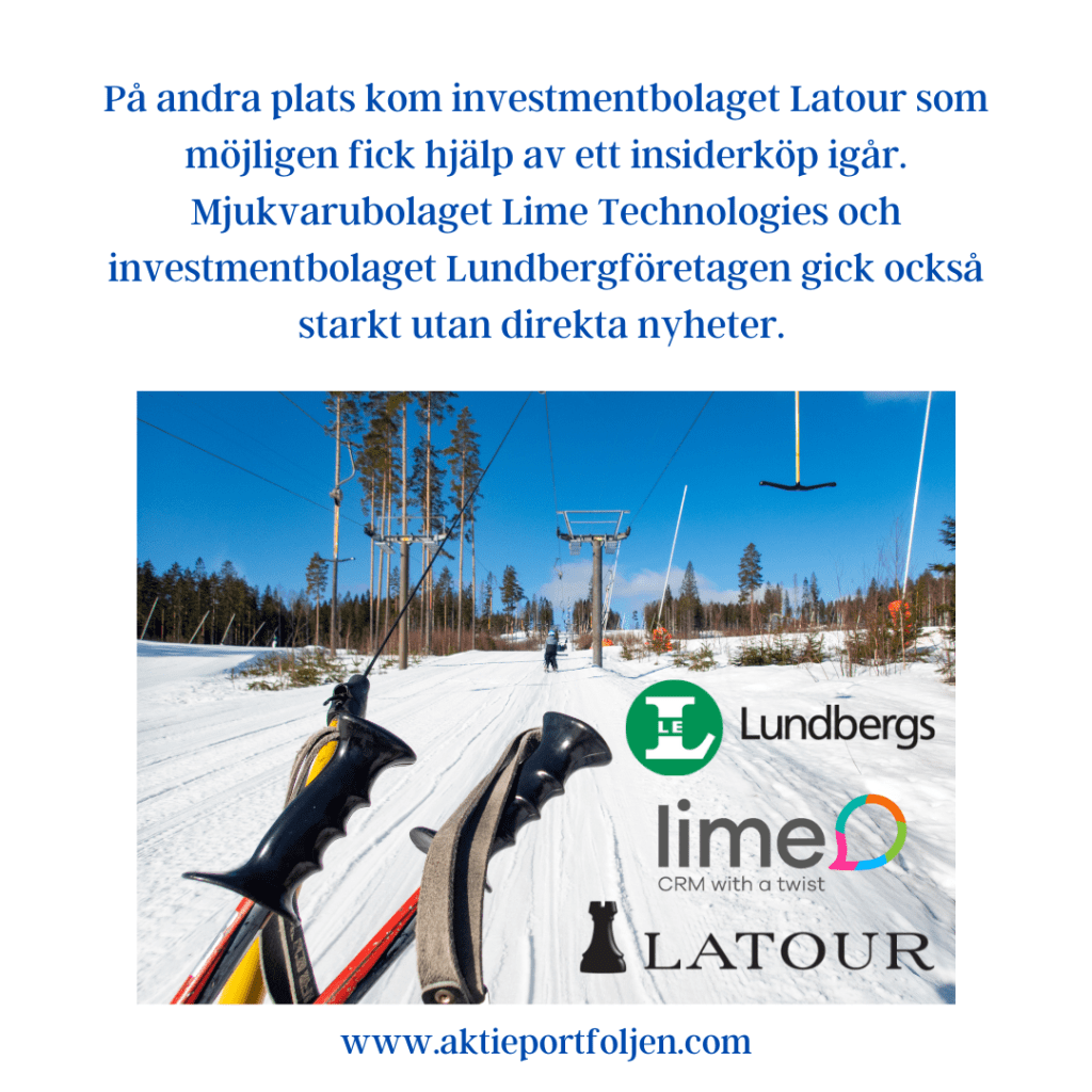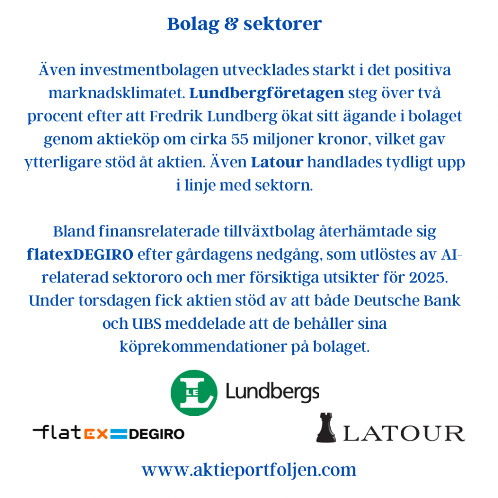 Även investmentbolagen utvecklades starkt i det positiva marknadsklimatet. Lundbergföretagen steg över två procent efter att Fredrik Lundberg ökat sitt ägande i bolaget genom aktieköp om cirka 55 miljoner kronor, vilket gav ytterligare stöd åt aktien. Även Latour handlades tydligt upp i linje med sektorn.