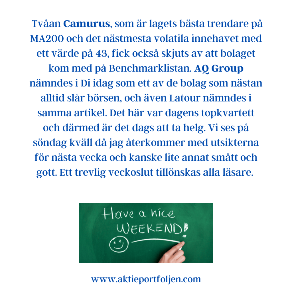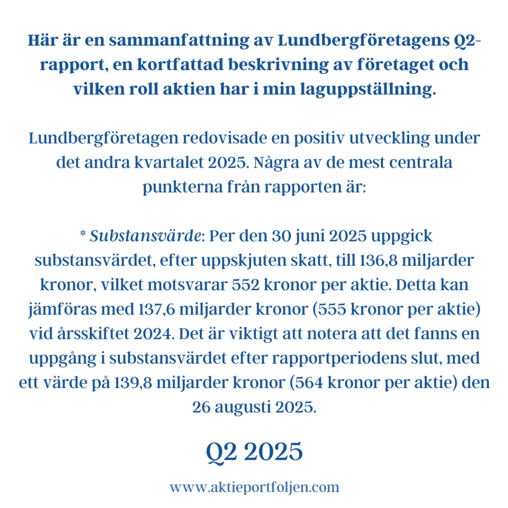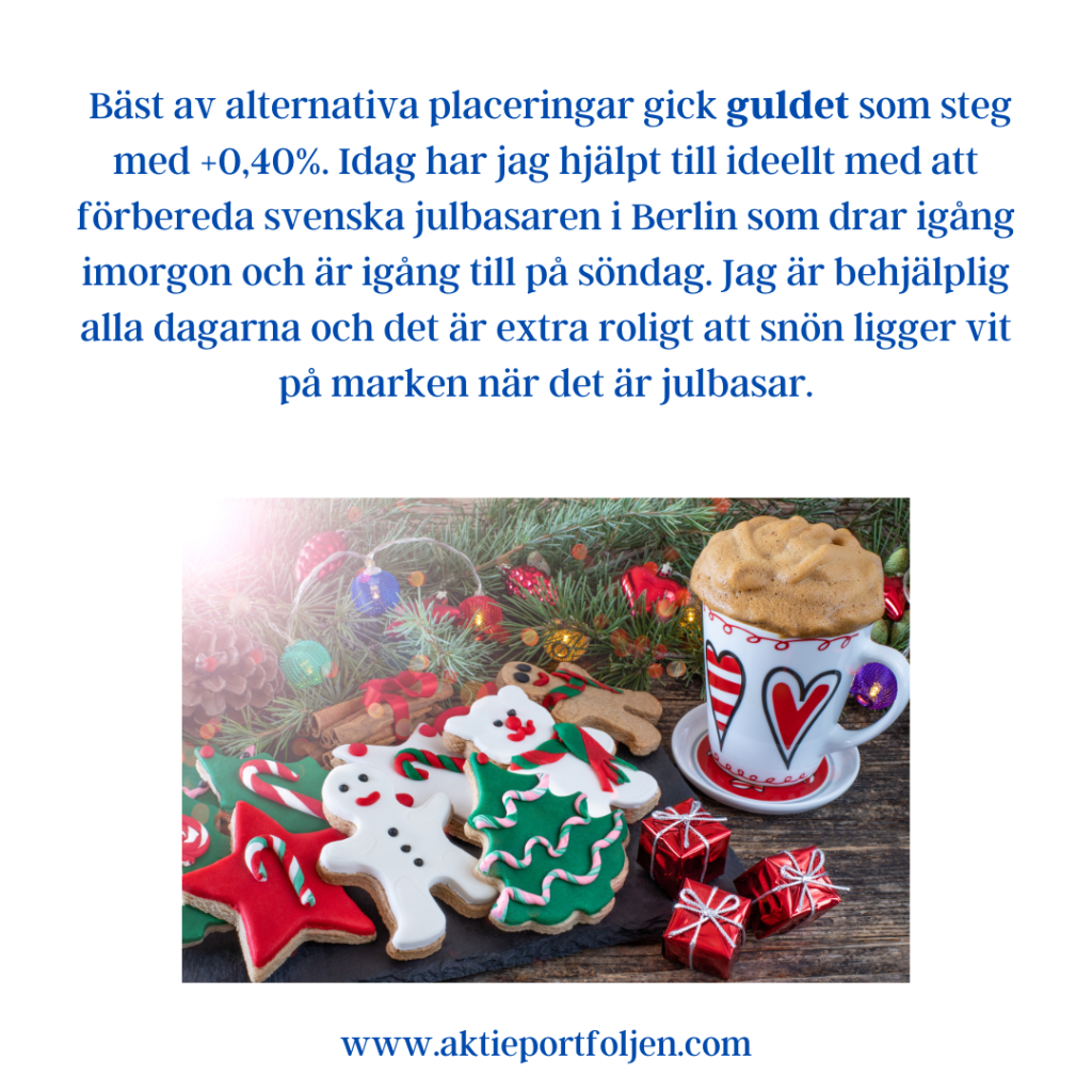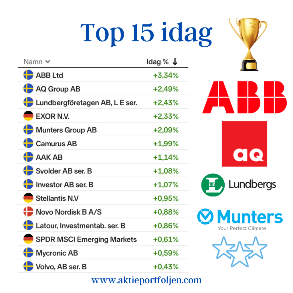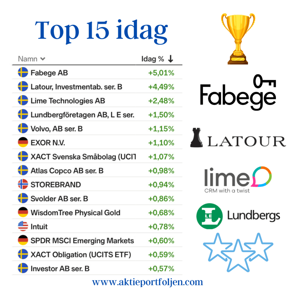 Catena AB +6,55 % Lundbergföretagen B +2,18 % flatexDEGIRO +2,11 % Storebrand +1,84 % SPDR MSCI Emerging Markets UCITS ETF +1,83 % Latour B +1,82 % Handelsbanken A +1,59 % Airbus +1,41 % ASSA ABLOY B +1,38 % AQ Group +1,38 % Essity B +1,28 % WisdomTree Physical Gold +1,26 % XACT Svenska Småbolag +1,15 % L&G Gold Mining UCITS ETF +1,13 % Nordnet +1,09 % VanEck Uranium & Nuclear Technologies ETF +0,99 % VanEck Defense UCITS ETF +0,95 % iShares DAX UCITS ETF +0,89 % Atlas Copco B +0,83 % Xtrackers STOXX Europe 600 UCITS ETF +0,73 %