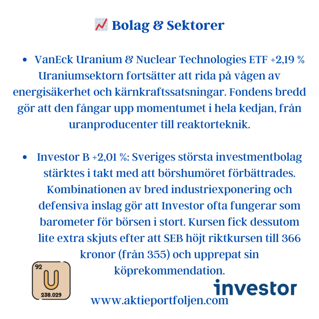 Bland ETF:er syntes ett brett riskpåslag. Tillväxtmarknader, europeiska index samt tematiska exponeringar mot försvar, uran och kärnteknik handlades samtliga på plus. Även guldrelaterade ETF:er steg, vilket signalerar att inflations- och osäkerhetshedgar fortsatt efterfrågas parallellt med aktier.