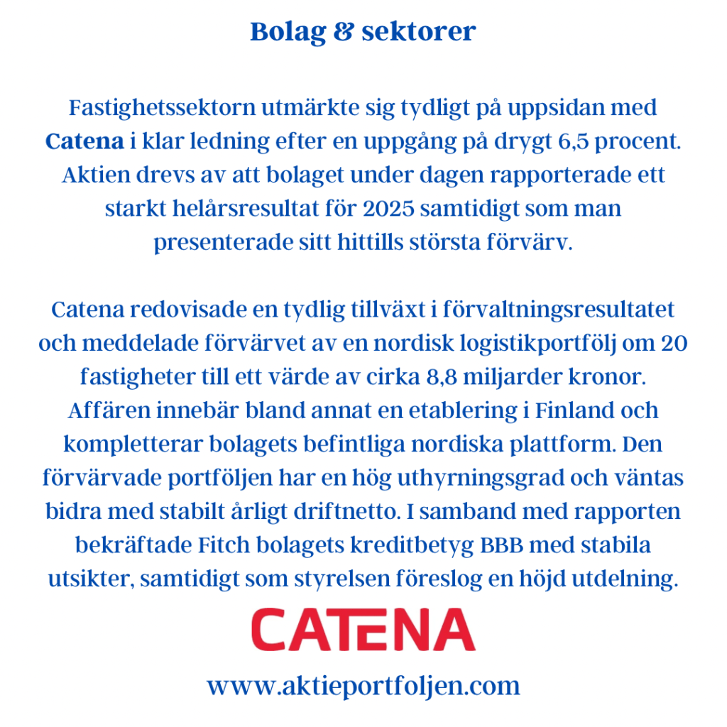 Fastighetssektorn utmärkte sig tydligt på uppsidan med Catena i klar ledning efter en uppgång på drygt 6,5 procent. Aktien drevs av att bolaget under dagen rapporterade ett starkt helårsresultat för 2025 samtidigt som man presenterade sitt hittills största förvärv.
