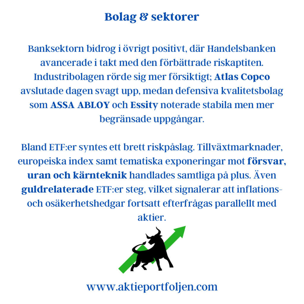 Banksektorn bidrog i övrigt positivt, där Handelsbanken avancerade i takt med den förbättrade riskaptiten. Industribolagen rörde sig mer försiktigt; Atlas Copco avslutade dagen svagt upp, medan defensiva kvalitetsbolag som ASSA ABLOY och Essity noterade stabila men mer begränsade uppgångar.