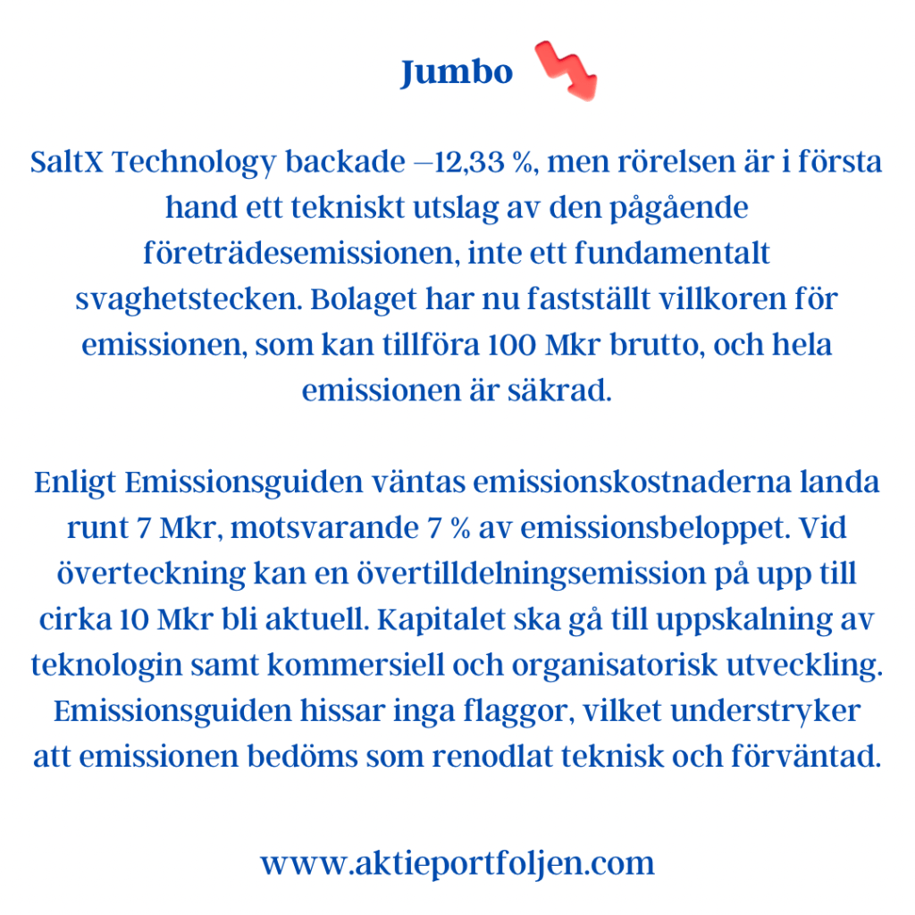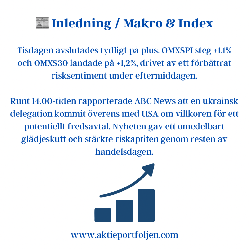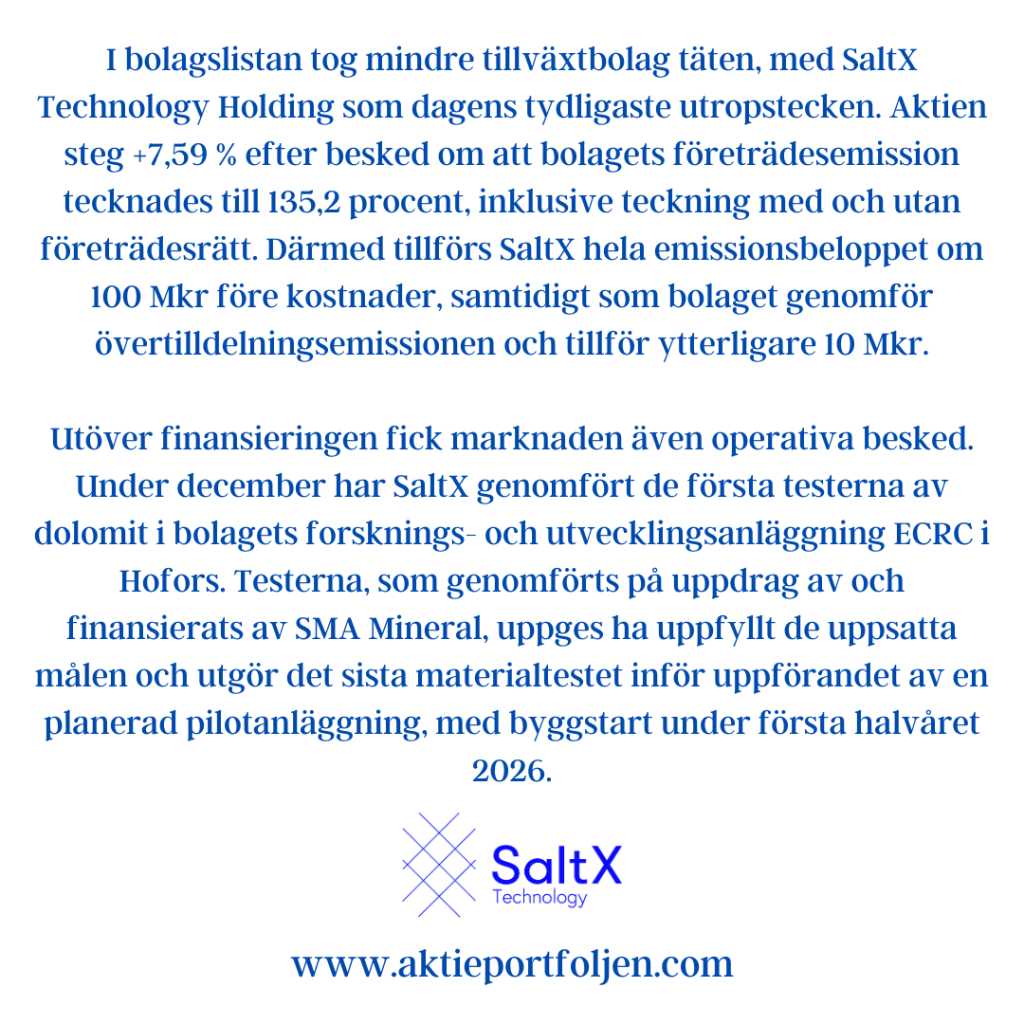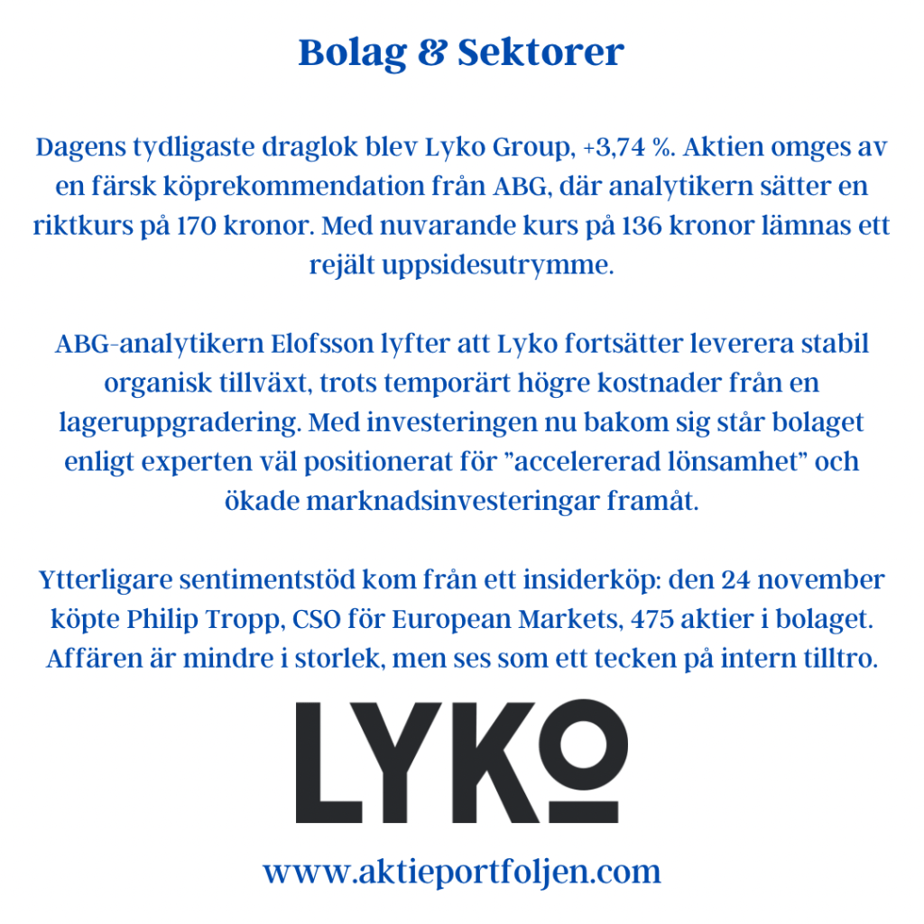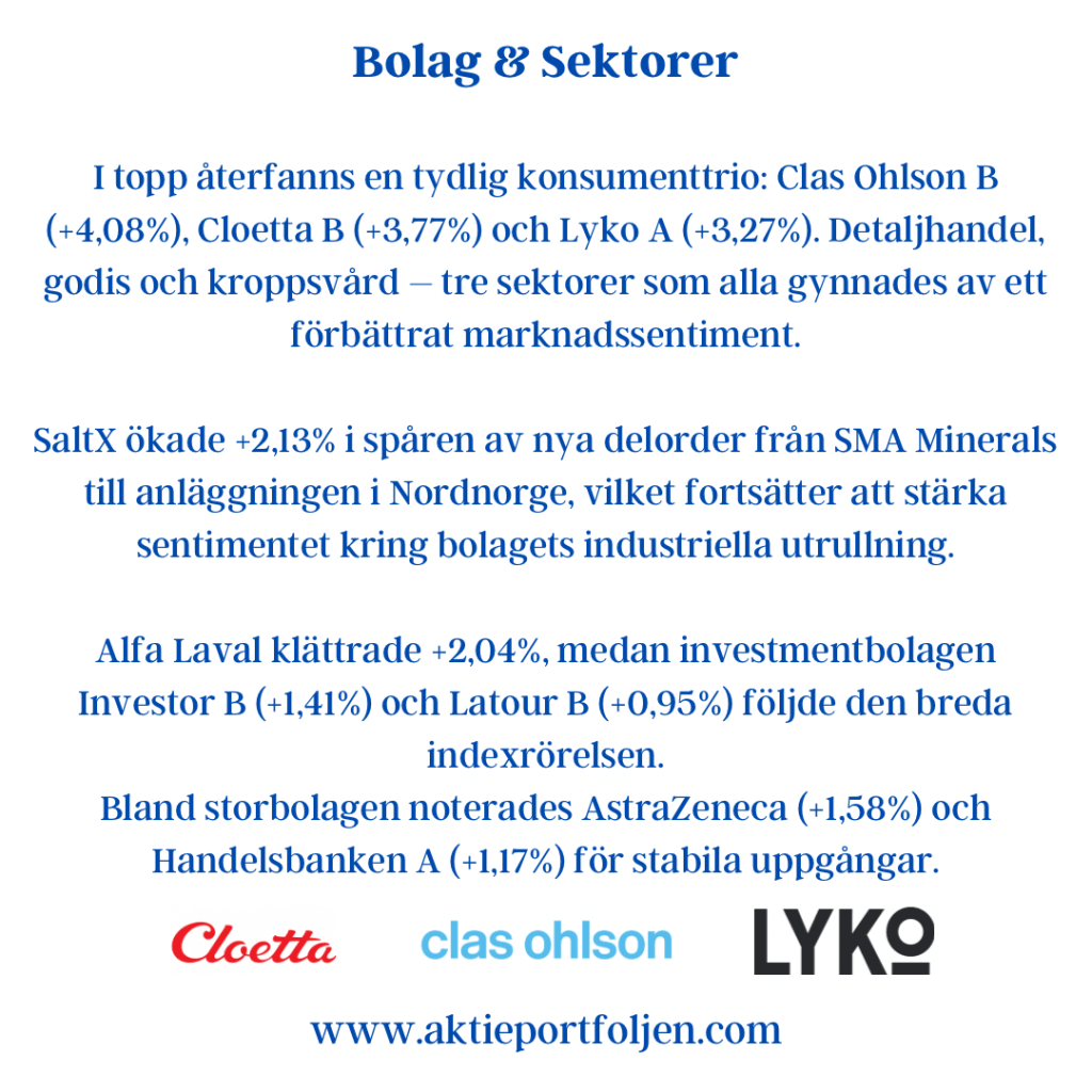 Samtidigt rörde sig finans- och plattformsbolag mer stillsamt men höll sig på rätt sida nollstrecket. Nordnet steg +0,22 % och flatexDEGIRO noterades upp +0,38 %, vilket speglar ett fortsatt aktivt men avvaktande investerarkollektiv.