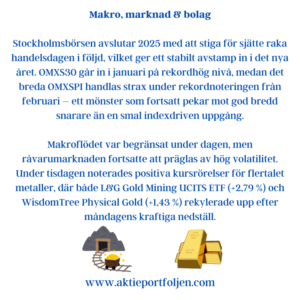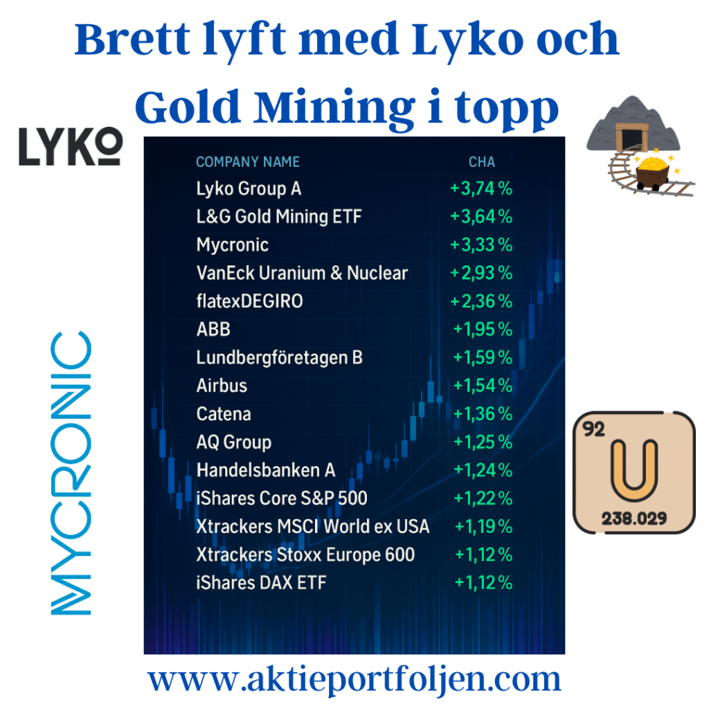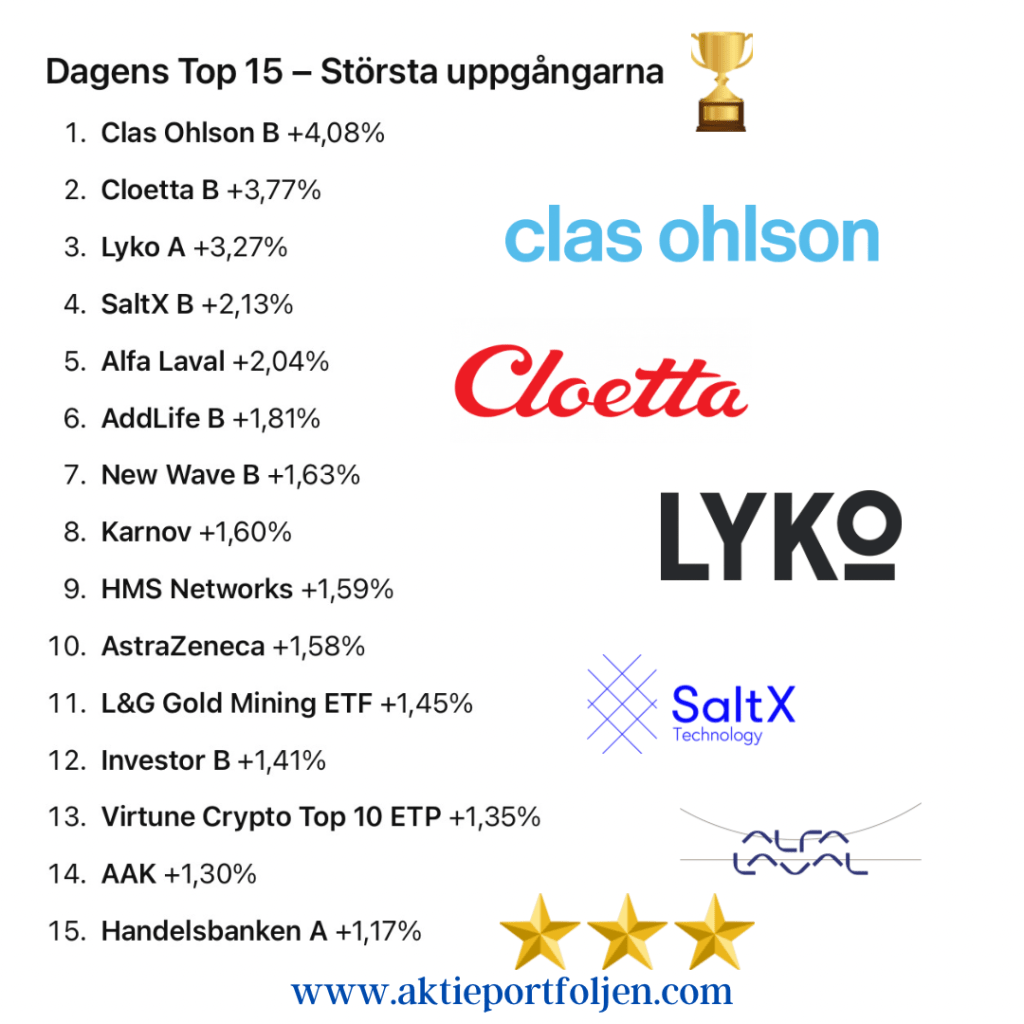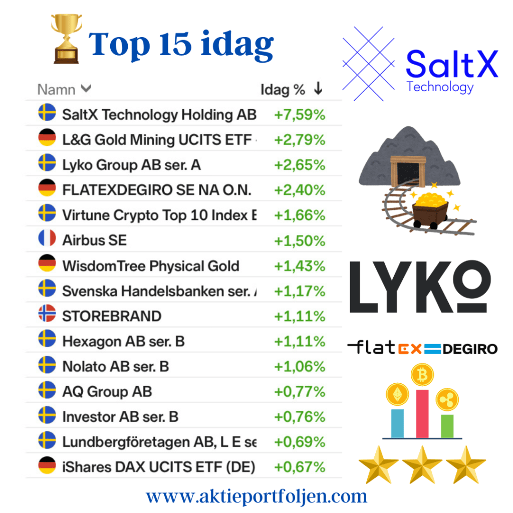 WisdomTree Physical Gold +2,34 % New Wave Group B +1,63 % Lyko Group A +1,58 % VanEck Uranium & Nuclear Technologies ETF +1,45 % Latour B +1,04 % Asker Healthcare Group +0,98 % L&G Gold Mining ETF +0,90 % Nolato B +0,59 % Alfa Laval +0,58 % Atlas Copco B +0,55 % flatexDEGIRO +0,38 % Spiltan Invest +0,32 % Handelsbanken A +0,29 % Lundbergföretagen B +0,29 % Nordnet +0,22 %