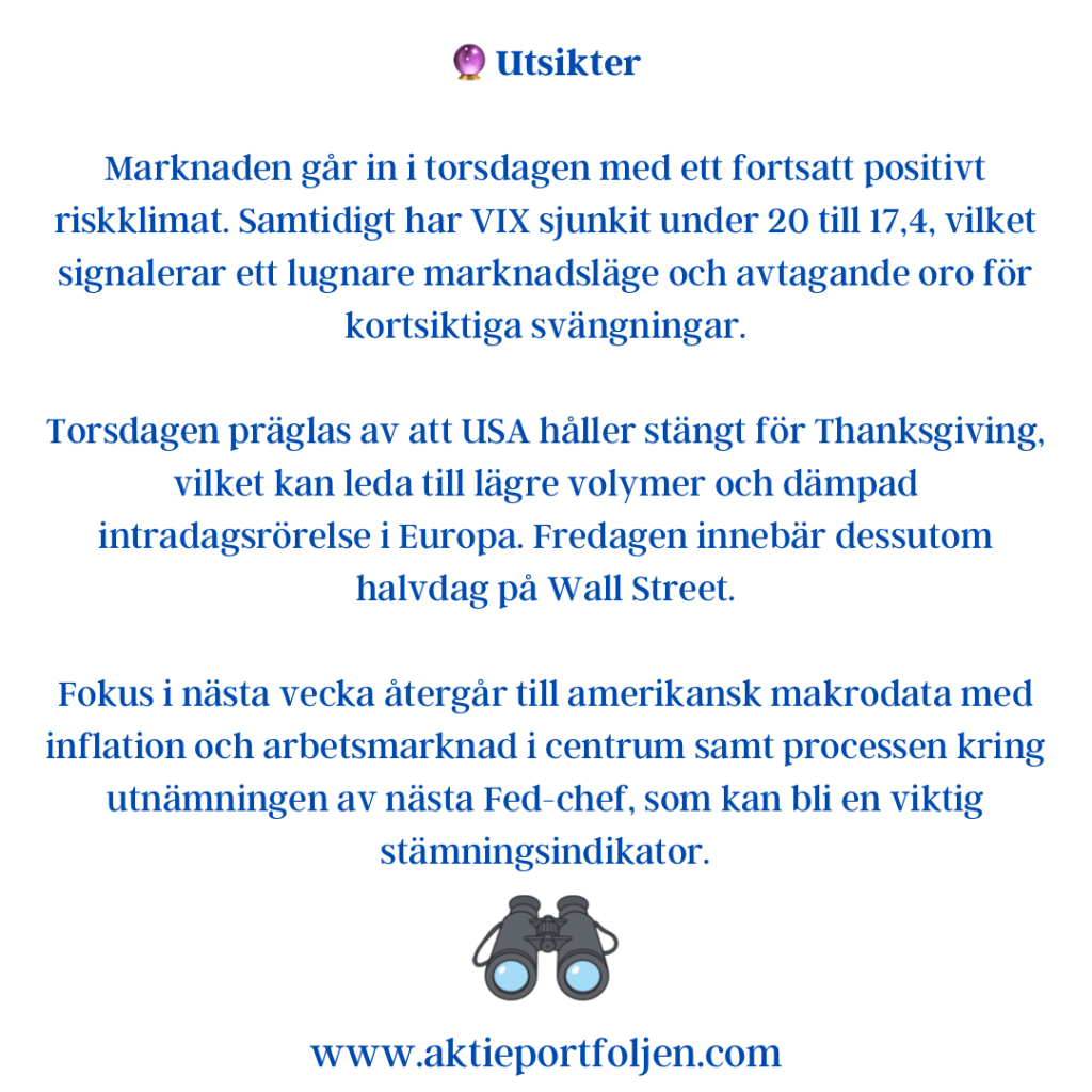 Volatilitetsindex VIX backade ned till 18,74 efter att tidigare ha varit uppe och vänt över 20-nivån – en nivå som ofta betraktas som gränsen för förhöjd marknadsoro. Nedgången indikerar att den akuta stressen i marknaden har dämpats, även om osäkerheten fortsatt är påtaglig.