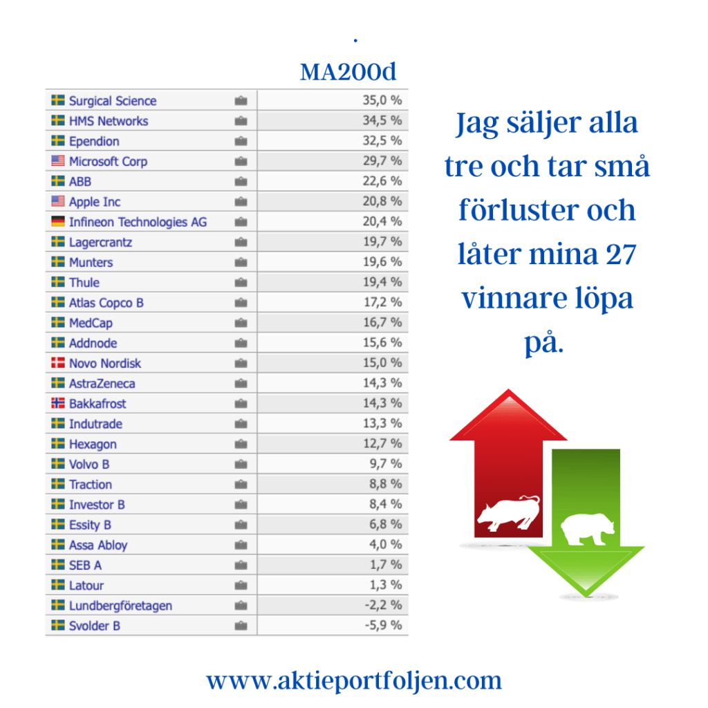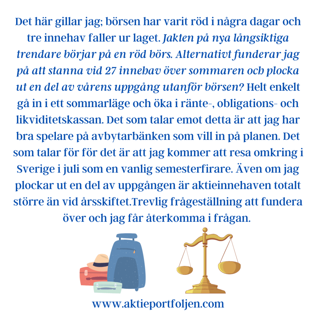 I bottenskiktet har jag gjort en vinsthemtagning i Novo Nordisk eftersom trenden fallit tydligt under MA200, men behållt halva innehavet, vilket är okej enligt regelboken. Det är faktiskt första gången jag använder den regeln. När det gäller VBG, som också är i negativ trend, vill jag helt enkelt bara avvakta rapporten som blir avgörande för om bolaget får vara kvar på plan.