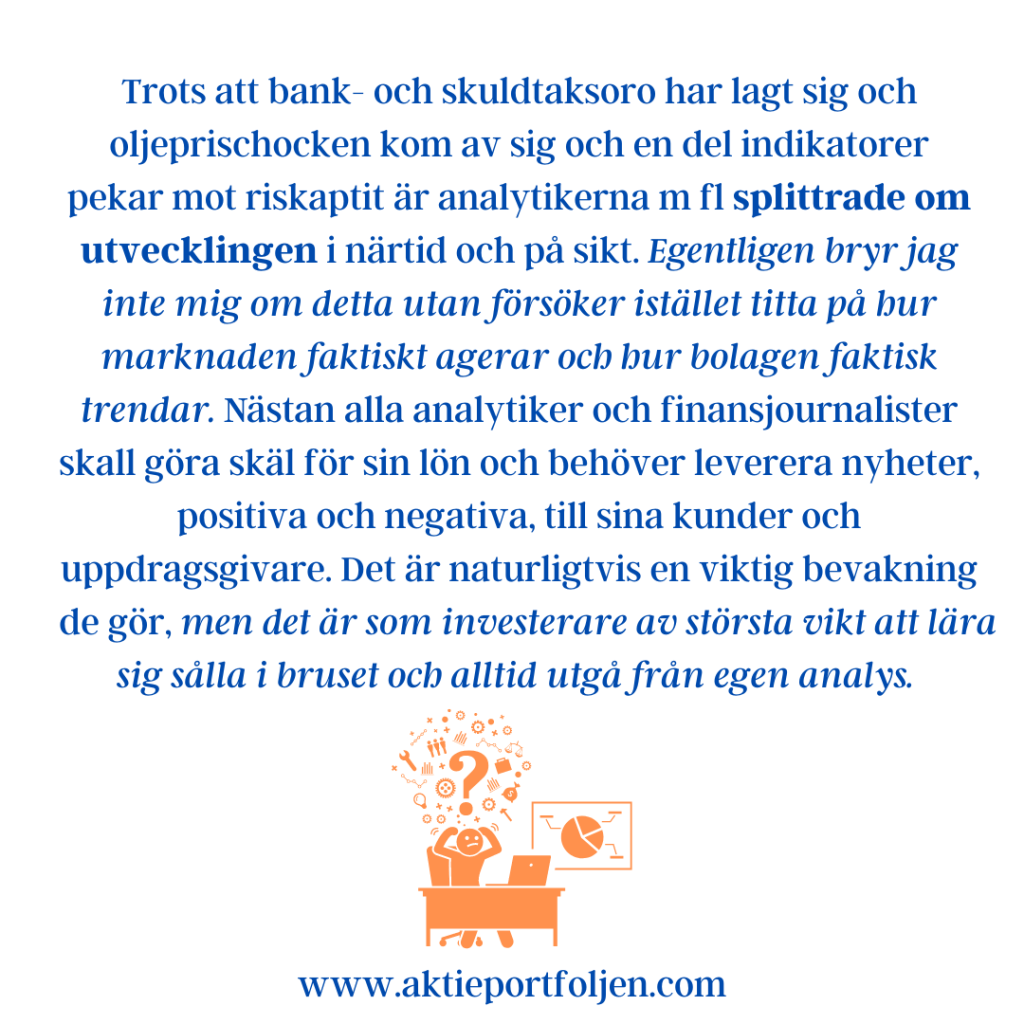 Min inställning är fortsatt bullish så länge börsindexen är i positiv trend. Jag kan tänka mig att minska i obligationer och likviditet för att öka i aktier under rapportperioden.