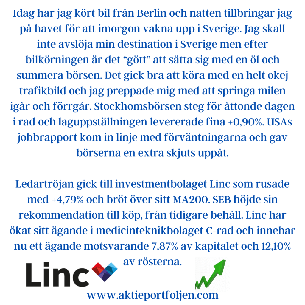 Jag tog en ny position i investmentbolaget Bure när jag viktade ned i kollegan Linc (-17,77%) som dök med anledning av deras största innehav Medcap vinstvarnade och rasade.
