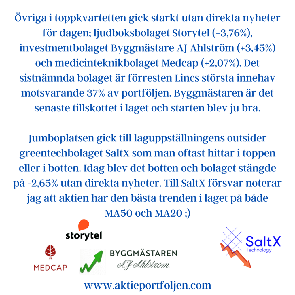 Jumboplatsen gick, som sagt, till Medcap (-29,98%) som vinstvarnade och aktien rasade rejält. Trots raset har Medcap varit en bra trade. Aktien var fortfarande upp +60% när jag idag avyttrade hela innehavet. Många gånger har jag även skördat den här aktien på toppen. Nu får den en välförtjänt vila på avbytarbänken.